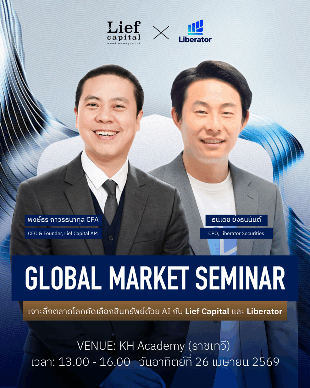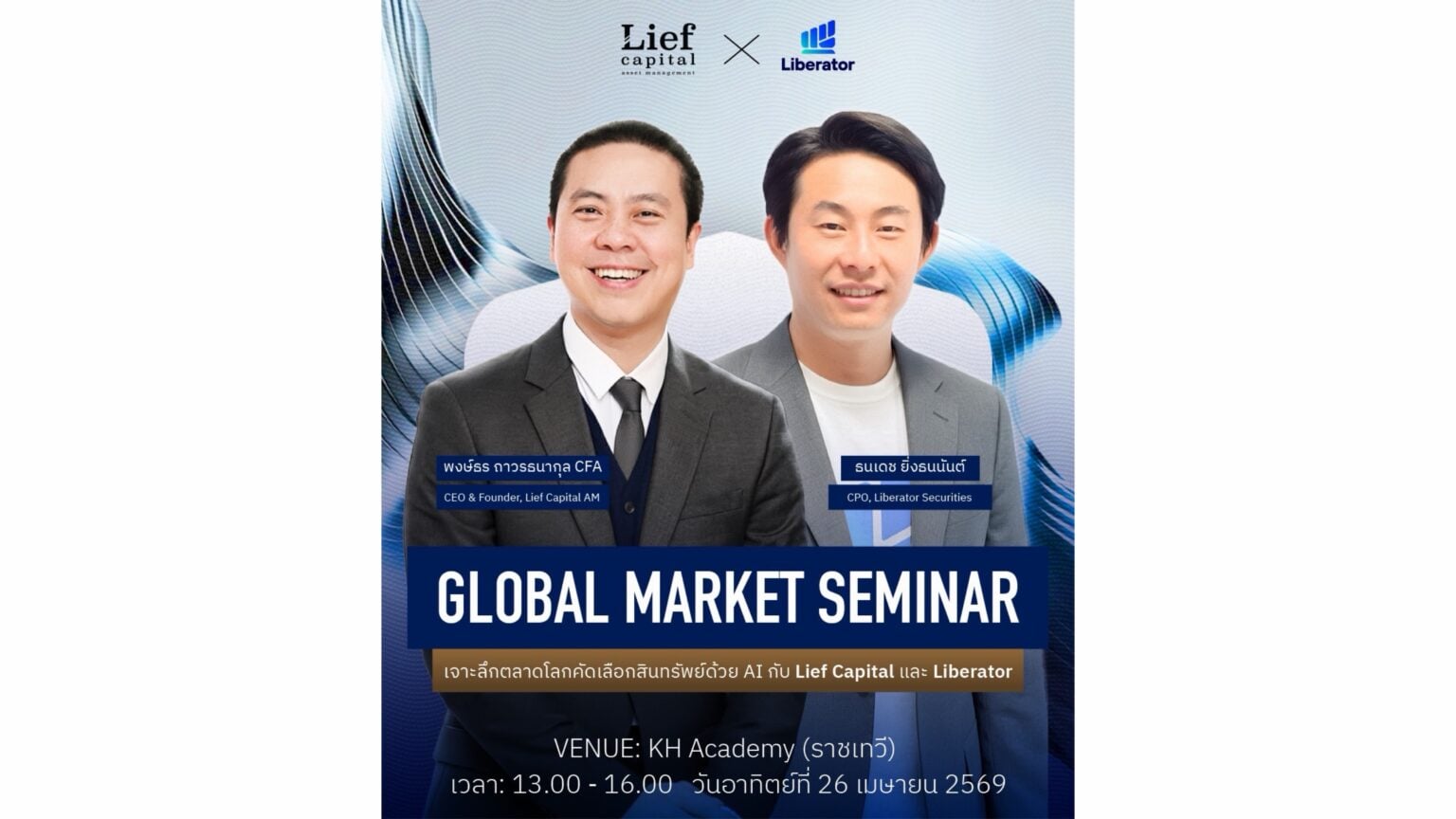 บริษัทหลักทรัพย์ ลิเบอเรเตอร์ จำกัด (Liberator Securities) ร่วมกับ บริษัทหลักทรัพย์จัดการกองทุน ลีฟแคปปิตอล จำกัด (Lief Capital) ผนึกกำลังจัดงานสัมมนา “Global Market” เสริมศักยภาพนักลงทุนไทยให้ก้าวทันโลกยุคใหม่ ที่การลงทุนไม่ได้จำกัดอยู่เพียงตลาดในประเทศอีกต่อไป พร้อมเปิดมุมมองเชิงลึกสู่โอกาสในตลาดหุ้นต่างประเทศ