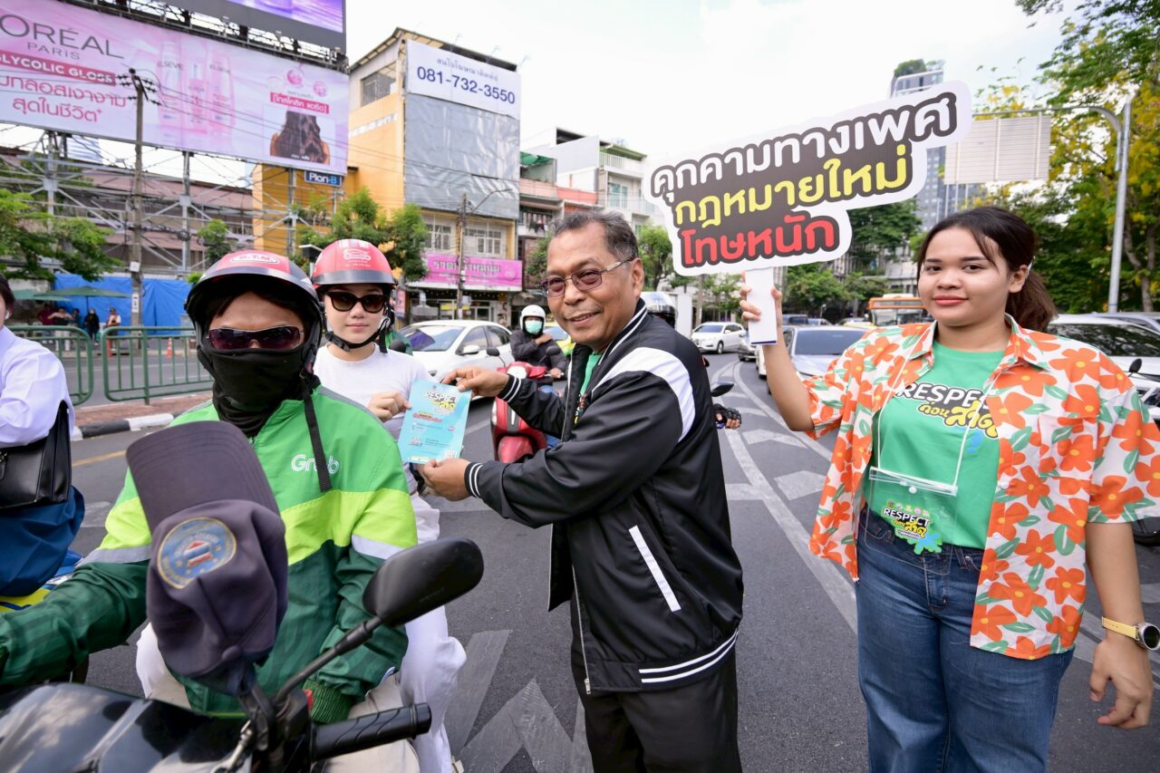 ด้าน น.ส.กรรณนิกา เจริญลักษณ์ ผอ.กองส่งเสริมความเสมอภาคระหว่างเพศ กรมกิจการสตรีและสถาบันครอบครัว กล่าวว่า ประเทศไทยได้ให้ความสำคัญกับเรื่องความเสมอภาค การเคารพในสิทธิและศักดิ์ศรีความเป็นมนุษย์ รวมถึงการคุ้มครองและพิทักษ์สิทธิสตรีในประเด็นของความรุนแรงทางเพศมาอย่างต่อเนื่อง แต่ยังมีข้อท้าทายคือ การเปลี่ยนทัศนคติชายเป็นใหญ่ และสะท้อนจากภาพการคุกคามทางเพศช่วงสงกรานต์ที่เพิ่มขึ้นทุกปี สอดคล้องกับผลสำรวจของมูลนิธิหญิงชายก้าวไกล โดยมีเครื่องดื่มแอลกอฮอล์เป็นตัวกระตุ้น ดังนั้น กิจกรรมรณรงค์ในครั้งนี้ จึงเป็นวาระสำคัญที่จะได้ร่วมมือกับภาคีฯ และกองบัญชาการตำรวจนครบาล เผยแพร่แนวคิด “Respect ก่อนสาด สงกรานต์ปลอดภัย ไม่คุกคามทางเพศ” ปรับเปลี่ยนเจตคติ สร้างความตระหนัก และสร้างการรับรู้ปัญหาความรุนแรงและการคุกคามทางเพศว่าเป็นเรื่องผิดกฎหมาย เพื่อให้ทุกคนปลอดภัย ไม่ถูกคุกคามทางเพศ และลดความสูญเสียในช่วงเทศกาลสงกรานต์ในมิติต่าง ๆ
