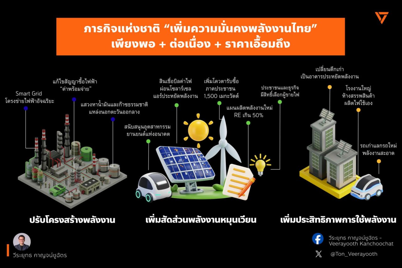 นายวีระยุทธ กล่าวว่า ตนขอเสนอว่ารัฐบาลจำเป็นต้องมีนโยบายเชิงรุกควบคู่กันไปด้วยการประกาศภารกิจแห่งชาติ คือ การเพิ่มความมั่นคงทางพลังงานให้แก่ประเทศไทย โดยมั่นคงหมายถึงต้องมีพลังงานเพียงพอ ต่อเนื่อง และราคาเอื้อมถึง เพื่อให้ทุกภาคส่วนทั้งภาครัฐ ภาคเอกชน และประชาชนทุกระดับ ร่วมกันเดินไปสู่เป้าหมายเดียวกัน ซึ่งการสร้างความมั่นคงทางพลังงาน ต้องดำเนินการพร้อมกัน 3 แนวทาง ได้แก่ การปรับโครงสร้างพลังงานของประเทศ การเพิ่มสัดส่วนพลังงานหมุนเวียน และการเพิ่มประสิทธิภาพการใช้พลังงานในประเทศ ทั้งนี้การใช้กลไกรัฐบังคับเพียงอย่างเดียวไม่ก่อให้เกิดการเปลี่ยนแปลง รัฐจำเป็นต้องทำให้ประชาชนเห็นว่า หากประเทศไทยเดินหน้าสู่ยุคใหม่ สู่ยุคที่มีความมั่นคงทางพลังงานแล้ว แต่ละคนจะมีชีวิตดีขึ้นได้อย่างไร การทำนโยบายในภาวะวิกฤติจึงต้องไม่หยุดอยู่เพียงเชิงรับ แต่ต้องมีภารกิจเชิงรุกด้วย เพื่อทำให้ทุกคนทุกองคาพยพในประเทศเห็นเป้าหมายเดียวกัน