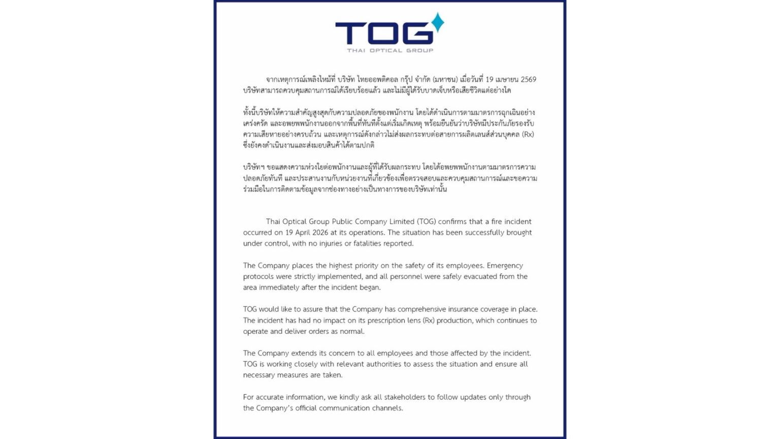 นายธรณ์ ประจักษ์ธรรม ประธานเจ้าหน้าที่บริหาร บริษัท ไทยออพติคอล กรุ๊ป จำกัด (มหาชน) กล่าวว่า บริษัทสามารถบริหารจัดการสถานการณ์ได้อย่างมีประสิทธิภาพ โดยยึดความปลอดภัยของพนักงานและความต่อเนื่องของธุรกิจเป็นสำคัญ “จากการประเมินเบื้องต้น เหตุการณ์ดังกล่าวอยู่ในขอบเขตที่สามารถควบคุมได้ บริษัทมีความพร้อมทั้งในด้านระบบประกันภัยและแผนรองรับการดำเนินงานทำให้ยังคงรักษาความต่อเนื่องของธุรกิจได้ โดยเฉพาะสายการผลิตหลักที่ยังดำเนินงานได้ตามปกติ ขณะเดียวกันทีมงานได้เร่งดำเนินการในส่วนที่ได้รับผลกระทบ เพื่อให้สามารถกลับมาดำเนินงานได้อย่างเต็มประสิทธิภาพโดยเร็วที่สุด”