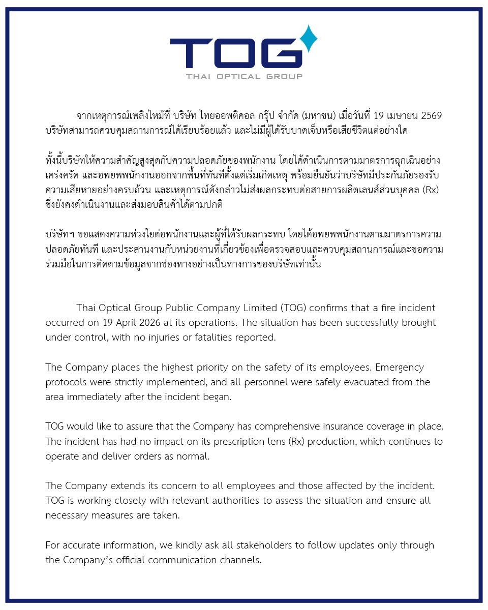 ทั้งนี้ บริษัทให้ความสำคัญสูงสุดกับความปลอดภัยของพนักงาน โดยได้ดำเนินการตามมาตรการฉุกเฉินอย่างเคร่งครัด และอพยพพนักงานออกจากพื้นที่ทันทีตั้งแต่เริ่มเกิดเหตุ พร้อมยืนยันว่าบริษัทมีประกันภัยรองรับความเสียหายอย่างครบถ้วน และเหตุการณ์ดังกล่าวไม่ส่งผลกระทบต่อ สายการผลิตเลนส์ส่วนบุคคล (Rx) ซึ่งยังคงดำเนินงานและส่งมอบสินค้าได้ตามปกติ