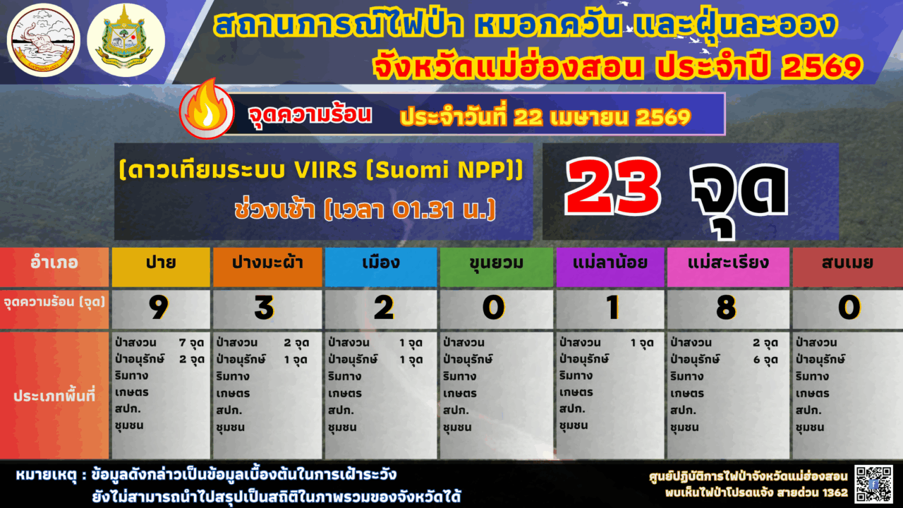 ทางด้าน ศูนย์ปฏิบัติการป้องกันและแก้ไขปัญหาไฟป่าฯ จังหวัดแม่ฮ่องสอน ขอรายงานจุดความร้อน (Hotspot) ดาวเทียม Suomi NPP ระบบ VIIRS ประจำวันที่ 22 เมษายน 2569 รอบเช้า เวลา 01.31 น. พบจุดความร้อน 23 จุด ซึ่งจะเห็นว่าจุดความร้อนได้เริ่มลดลงอย่างต่อเนื่อง