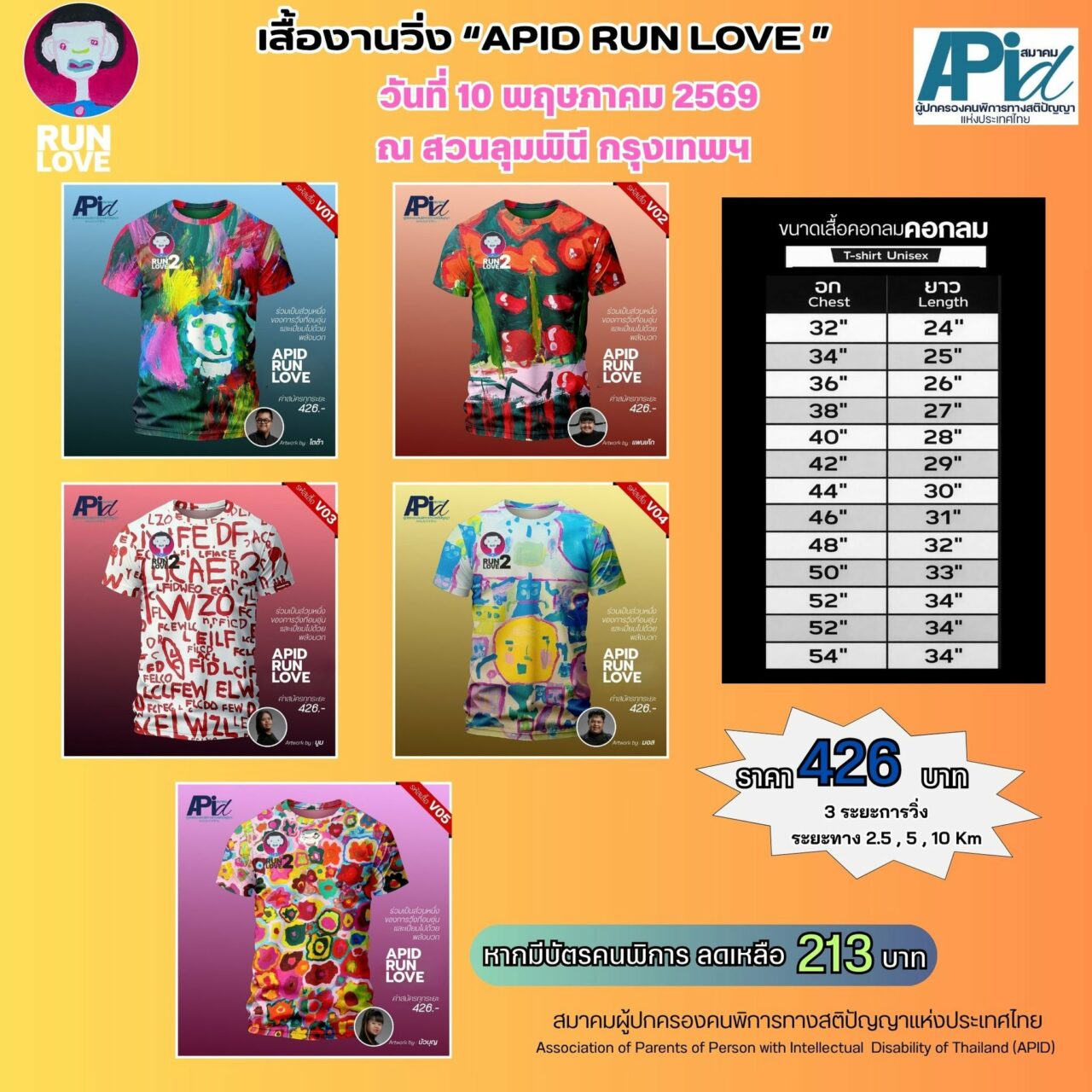 นอกจากนี้ เสื้องานวิ่ง “APID Run Love” อยู่ในราคาเพียง 426 บาท (ทุกระยะ) ผู้พิการที่มีบัตรประจำตัว ราคาเพียง 213 บาท ใส่เสื้อวิ่งไปด้วยกัน แล้วส่งต่อพลัง “Run Love” ให้สังคม มาร่วมเป็นส่วนหนึ่งในการสนับสนุนศักยภาพของน้องๆ แล้วพบกันในวันที่เราจะ “วิ่งไปด้วยกัน”