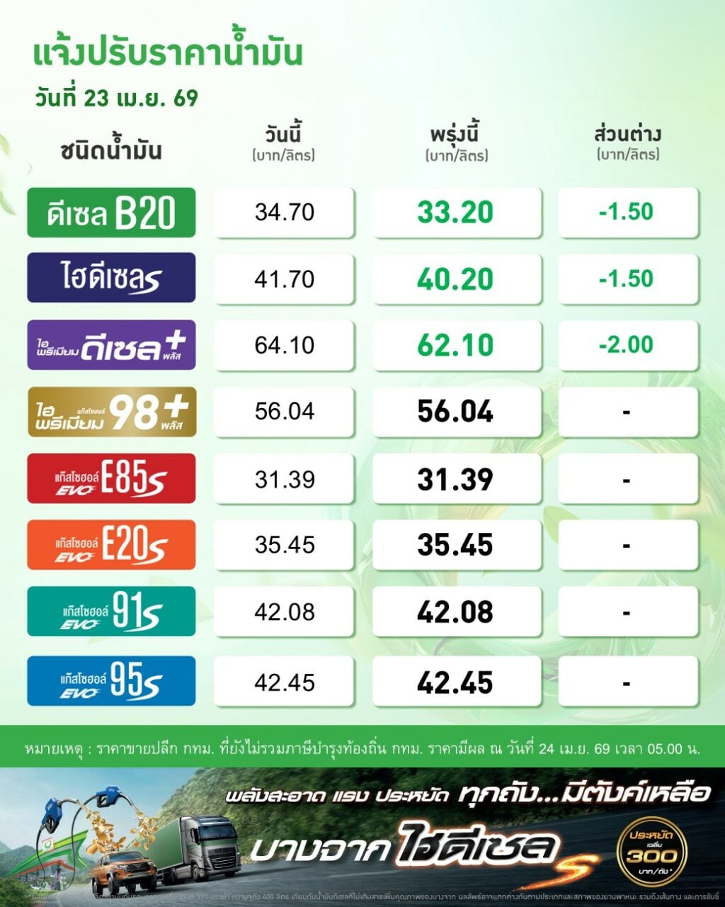 ปั๊มปตท. และปั๊มบางจาก ได้ประกาศปรับราคาขายปลีกน้ำมัน กลุ่มดีเซลทุกชนิด ลดลง 1.50 บาทต่อลิตร ส่วนน้ำมันชนิดอื่นคงเดิม มีผล 24 เม.ย. 2569 เวลา 05.00 น. เป็นต้นไป โดยราคาขายปลีกจะเป็นดังนี้ เบนซิน = 52.04 บาท, แก๊สโซฮอล์ 95 = 42.45 บาท, E20 = 35.45 บาท, E85 = 31.39 บาท, แก๊สโซฮอล์ 91 = 42.08 บาท, พรีเมี่ยม GSH95 = 51.54 บาท, ดีเซล B7 = 40.20 บาท, HSD B20 = 33.20 บาท, พรีเมียมดีเซล = 62.10 บาท โดยราคาขายปลีกข้างต้นยังไม่รวมภาษีบำรุงกรุงเทพมหานคร