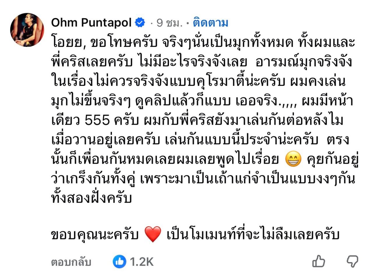 ล่าสุด “โอม ปัณฑพล” ไม่ปล่อยให้คนเข้าใจผิดนาน รุดเข้าไปคอมเมนต์เคลียร์ชัดกลางเพจ “ใต้เตียงดารา” แบบทันควัน ยอมรับผิดแต่โดยดี ว่าสิ่งที่เห็นในคลิปคือมุกของตัวเองล้วนๆ โดยเจ้าตัวระบุว่า “โอยย, ขอโทษครับ จริงๆ นั่นเป็นมุกทั้งหมด ทั้งผมและพี่คริสเลยครับ ไม่มีอะไรจริงจังเลย อารมณ์มุกจริงจังในเรื่องไม่ควรจริงจังแบบคุโรมาตี้น่ะครับ ผมคงเล่นมุกไม่ขึ้นจริงๆ ดูคลิปแล้วก็แบบ เออจริง…. ผมมีหน้าเดียว 555”