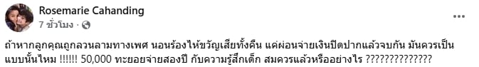 ล่าสุด โรสแมรี่ ได้ออกมาโพสต์ข้อความผ่านโซเชียลมีเดียส่วนตัว เปิดเผยเรื่องราวสุดสะเทือนใจที่เกิดขึ้นกับลูกชายหัวแก้วหัวแหวน โดยเรื่องราวถูกเปิดเผย เมื่อเธอได้โพสต์ข้อความในลักษณะตั้งคำถาม หลังเกิดเหตุการณ์เลวร้ายกับลูกชายของเธอ โดยระบุข้อความชวนช็อกว่า “ถ้าหากลูกคุณถูกลวนลามทางเพศ นอนร้องไห้ขวัญเสียทั้งคืน แค่ผ่อนจ่ายเงินปิดปากแล้วจบกัน มันควรเป็นแบบนั้นไหม!!!!!! 50,000 ทยอยจ่ายสองปี กับความรู้สึกเด็ก สมควรแล้วหรืออย่างไร??????????????” นอกจากโพสต์ดังกล่าวแล้ว โรสแมรี่ ยังได้เข้ามาตอบคอมเมนต์เพิ่มเติมถึงอาการของลูกชาย โดยเธอบอกว่า “ตามข่าวนะคะ ตอนนี้ใจแม่สลาย น้องร้องไห้กอดแม่แน่นทั้งคืน รายละเอียดจะอยู่ในข่าวค่ะ”