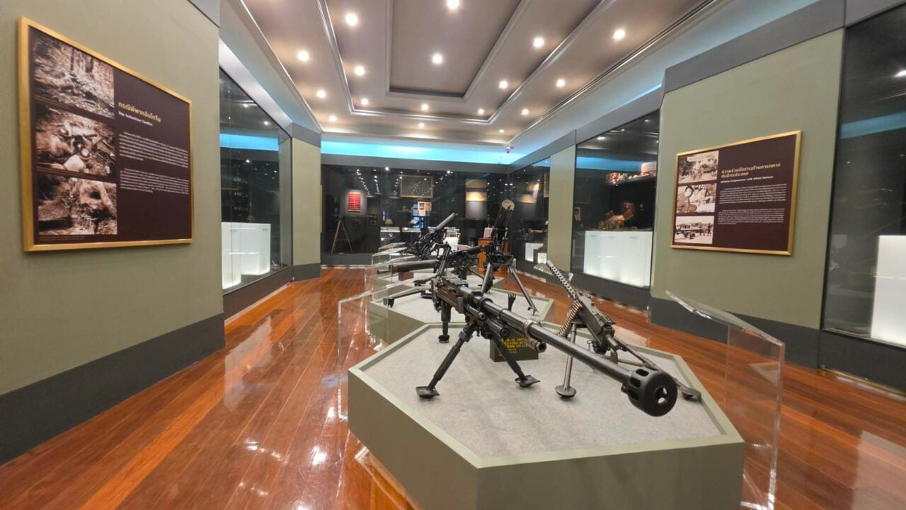 ชั้นล่างสุดเป็น “ห้องจำลองเหตุการณ์ทางประวัติศาสตร์” จัดแสดงเหตุการณ์จำลองวีรกรรมการรบทางบกครั้งสำคัญของไทย โดยมีอาวุธประเภทฟันและแทง ซึ่งใช้ในการรบสมัยโบราณ เช่น ดาบ กระบี่ หอก ง้าว และทวน จัดแสดงไว้ด้วย ฝั่งตรงข้ามคือ “ห้องอาวุธ” มีการจัดแสดงอาวุธปืนซึ่งกองทัพบกนำไปใช้ในราชการสงครามตั้งแต่สมัยอยุธยาตอนปลายจนถึงสมัยสงครามเวียดนาม ซึ่งมีการจัดแสดงวิวัฒนาการเครื่องแบบที่ใช้ในแต่ละยุคสมัย มีหมวกทหารในกรณีพิพาทอินโดจีนและสงครามมหาเอเชียบูรพา ที่ทายาทได้นำมามอบให้ทางพิพิธภัณฑ์ซึ่งยังคงมีรอยกระสุนให้เห็น ทั้งยังมีแผ่นป้ายชื่อประจำตัวทหารรูปวงกลมมีรอยปรุตรงกลางตามแบบทหารฝรั่งเศส ก่อนจะเปลี่ยนเป็นสีเหลี่ยมผืนผ้าคู่อย่างที่เห็นในยุคหลัง