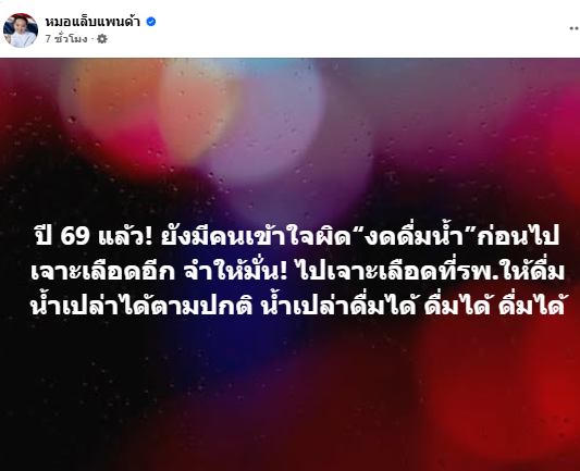 เมื่อวันที่ 24 เม.ย. 69 ผู้สื่อข่าวรายงานว่า กระแสข้อถกเถียงเรื่อง “ก่อนเจาะเลือดดื่มน้ำได้หรือไม่” กลับมาเป็นประเด็นในโลกออนไลน์ จากโพสต์ที่ถูกเผยแพร่ต่อเนื่อง โดยแฟนเพจ “หมอแล็บแพนด้า” เผยว่า “ปี 69 แล้ว ยังมีคนเข้าใจผิด “งดดื่มน้ำ” ก่อนไปเจาะเลือดอีก จำให้มั่น! ไปเจาะเลือดที่ รพ. ให้ดื่มน้ำเปล่าได้ตามปกติ น้ำเปล่าดื่มได้ ดื่มได้ ดื่มได้” พร้อมอธิบายว่าไปเจาะเลือดที่โรงพยาบาลสามารถดื่มน้ำเปล่าได้ปกติ
