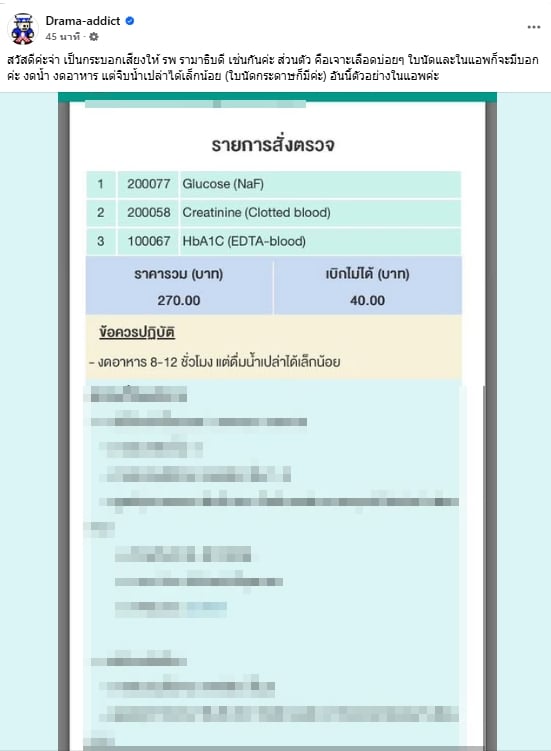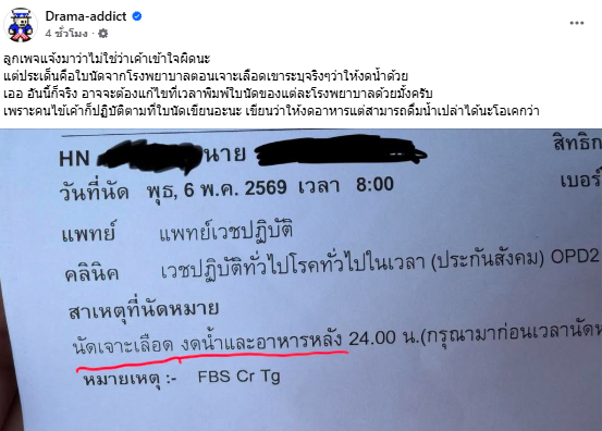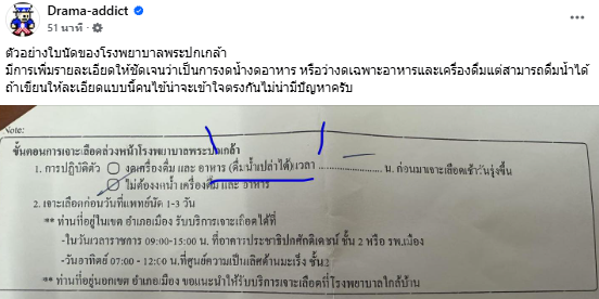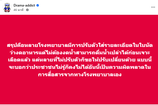 อีกทั้ง ทางด้านแฟนเพจ “Drama-addict” ได้ออกมาอธิบายอีกครั้งว่า “สรุป คือ หลายโรงพยาบาล มีการปรับตัวใส่รายละเอียดในใบนัดว่างดอาหาร แต่ไม่ต้องงดน้ำ สามารถดื่มน้ำเปล่าได้ก่อนเจาะเลือดแล้ว แต่หลายที่ไม่ปรับตัว ก็ขอให้ปรับเปลี่ยนด้วย แบบนี้จะบอกว่าประชาชนไม่รู้ก็คงไม่ได้ อันนี้เป็นความผิดพลาดในการสื่อสารจากทางโรงพยาบาลเอง”