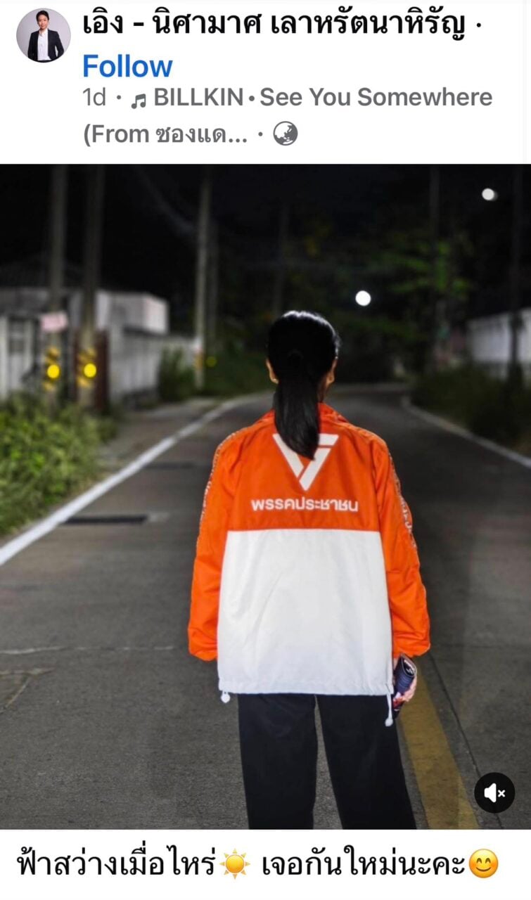 โดยก่อนหน้านั้น น.ส.นิศามาศ โพสต์ภาพสวมเสื้อแจ๊กเกตพรรคประชาชนหันหลัง พร้อมข้อความมระบุว่า ฟ้าสว่างเมื่อไหร่ เจอกันใหม่นะคะ