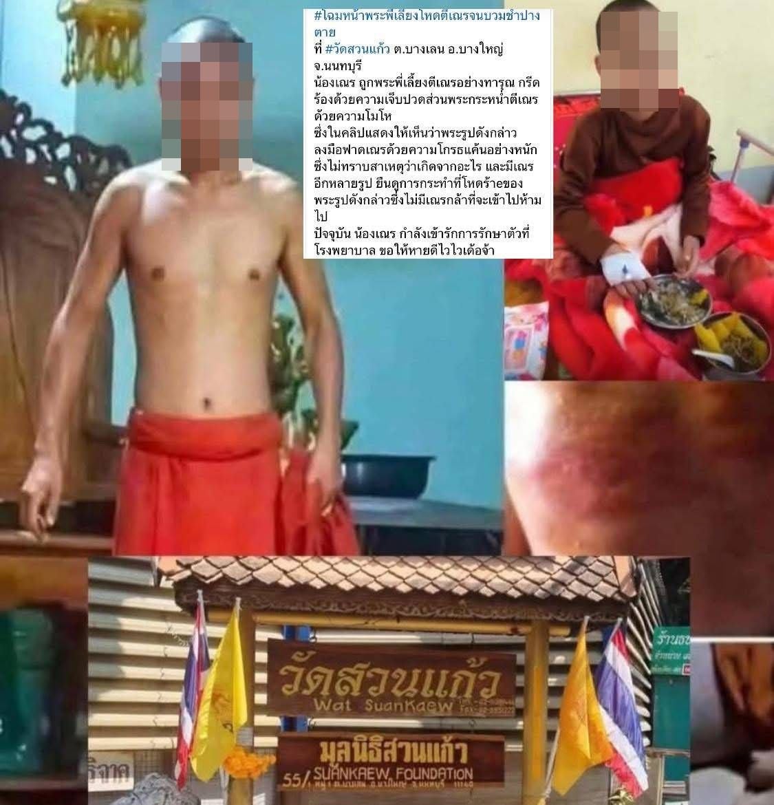 เมื่อวันที่ 25 เม.ย. ผู้สื่อข่าวรายงานว่า มีผู้ใช้ Facebook รายหนึ่งโพสต์ภาพและข้อความกล่าวอ้างว่า มีพระภายในวัดสวนแก้ว ต.บางเลน อ.บางใหญ่ จ.นนทบุรี ทำร้ายเณรจนได้รับบาดเจ็บ โดยระบุข้อความในลักษณะว่าเป็นเหตุการณ์รุนแรง พระพี่เลี้ยงใช้กำลังทำร้ายเณรจนบวมช้ำ พร้อมทั้งมีการเผยแพร่ภาพหน้าวัดสวนแก้วประกอบโพสต์ และมีการบรรยายเหตุการณ์ในคลิปว่า พระรูปดังกล่าวลงมือฟาดเณรด้วยความโกรธอย่างหนัก โดยไม่ทราบสาเหตุ อีกทั้งยังมีเณรหลายรูปอยู่ในเหตุการณ์แต่ไม่มีใครกล้าเข้าห้าม ขณะเดียวกันยังระบุว่าเณรรูปดังกล่าวกำลังเข้ารับการรักษาที่โรงพยาบาล พร้อมขอให้หายโดยเร็ว