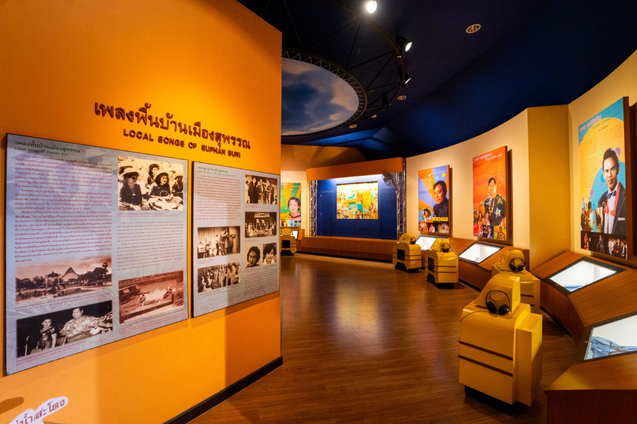 แต่หากต้องการเจาะลึกความเป็นเมืองดนตรีให้ครบถ้วน อย่าลืมแวะไปที่ “ห้องจัดแสดงประวัติศาสตร์ดนตรีเมืองสุพรรณ” ภายใน “พิพิธภัณฑ์สถานแห่งชาติ สุพรรณบุรี” ทันทีที่ก้าวเข้าสู่ห้องนี้จะได้รับรู้เรื่องราวของศิลปินเลือดสุพรรณตั้งแต่อดีตจนถึงปัจจุบัน ทั้งระดับศิลปินแห่งชาติ ครูเพลง ไปจนถึงร็อกสตาร์รุ่นใหม่ นอกจากนี้ยังมีการจัดแสดงเครื่องดนตรีและวิถีชีวิต ทั้งเพลงอีแซว เพลงเรือ และลำตัด พร้อมหุ่นจำลองการละเล่นที่ทำให้เห็นภาพว่าในอดีตชาวสุพรรณฯ ใช้เพลงเหล่านี้ในการโต้ตอบกันอย่างไร