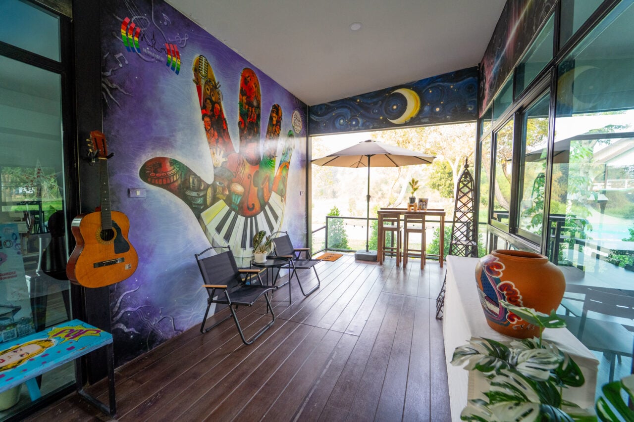 ขณะที่ “Ma Mu Me” (มา มู มี) คาเฟ่ในสไตล์มินิมอลที่ซ่อนตัวอยู่ในพื้นที่ของ ดาราปุระ วังยาง รีสอร์ท อำเภอศรีประจันต์ ไม่ใช่แค่คาเฟ่ที่เปิดต้อนรับผู้มาเยือนให้มานั่งชิล แต่ยังมีส่วนเสริมสำคัญอย่างการสอนร้องเพลง เปิดเป็นห้องอัดให้ใคร ๆ ที่นึกอยากอัดเสียงร้องของตัวเองลงแผ่นแบบนักร้องมืออาชีพบ้างสักครั้ง รวมไปถึงเปิดสอนเด็ก ๆ ที่อยู่ในละแวกใกล้เคียงให้เข้ามาเรียนดนตรีเพื่อสร้างนักดนตรีรุ่นใหม่ของสุพรรณบุรี ทั้งยังมีกิจกรรมพิเศษอย่างการแสดงดนตรีแนวอะคูสติกเบา ๆ เข้ากับบรรยากาศผ่อนคลายโดยรอบด้วย