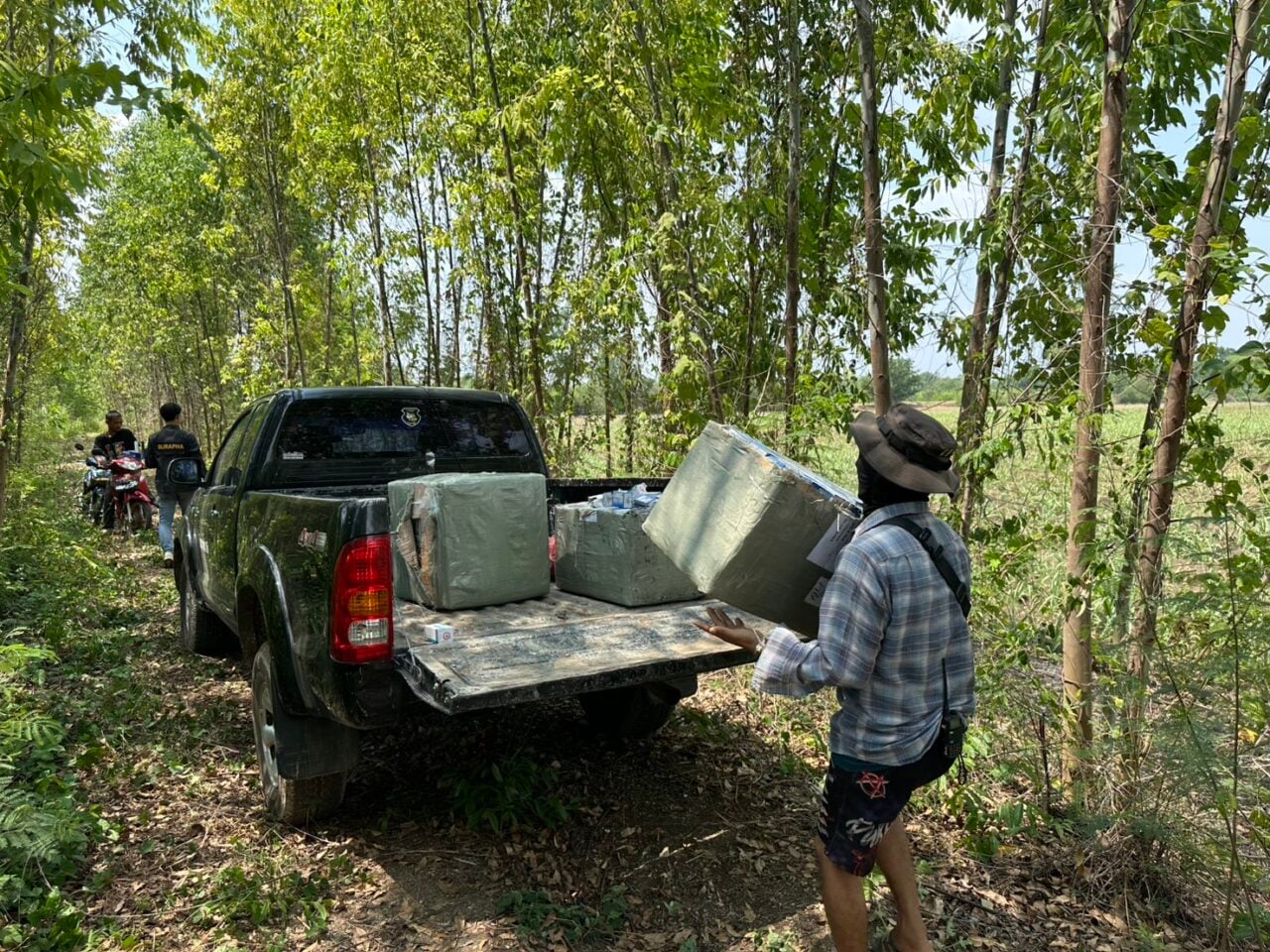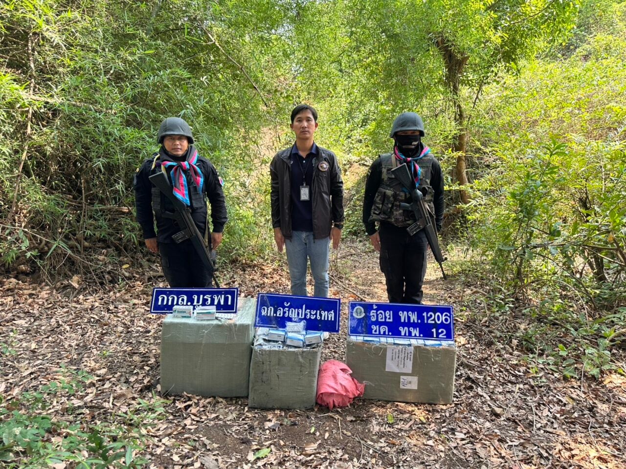 ขณะเจ้าหน้าที่ชุดลาดตระเวนปฏิบัติหน้าที่มาถึงบริเวณเส้นทางธรรมชาติ ระหว่างจุดตรวจ อ.48 – 49 บ.เนินสมบูรณ์ ม.12 ต.คลองน้ำใส อ.อรัญประเทศ จ.สระแก้ว ได้ตรวจพบชายต้องสงสัยไม่ทราบสัญชาติ จำนวน 2 ราย กำลังช่วยกันแบกกล่องกระสอบสีเทาขนาดใหญ่ข้ามแดนเข้ามาอย่างมีพิรุธ เจ้าหน้าที่จึงแสดงตัวเพื่อขอเข้าทำการตรวจสอบ