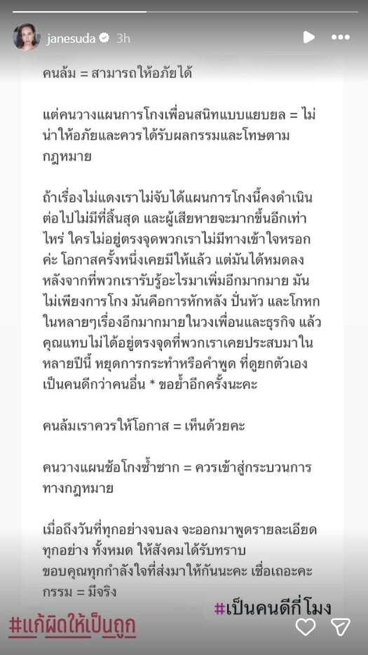 หลังจากโพสต์สตอรี่นี้ไปนั้นทำเอาหลายคนให้ความสนใจหนักมาก คงต้องติดตามกันต่อว่าเจนสุดาจะออกมาฟาดต่อหรือไม่