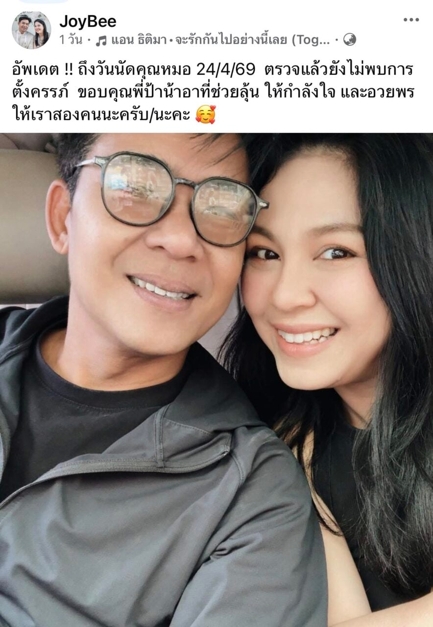“อัปเดต !! ถึงวันนัดคุณหมอ 24/4/69 ตรวจแล้วยังไม่พบการตั้งครรภ์ ขอบคุณพี่ป้าน้าอาที่ช่วยลุ้น ให้กำลังใจ และอวยพรให้เราสองคนนะครับ/นะคะ”