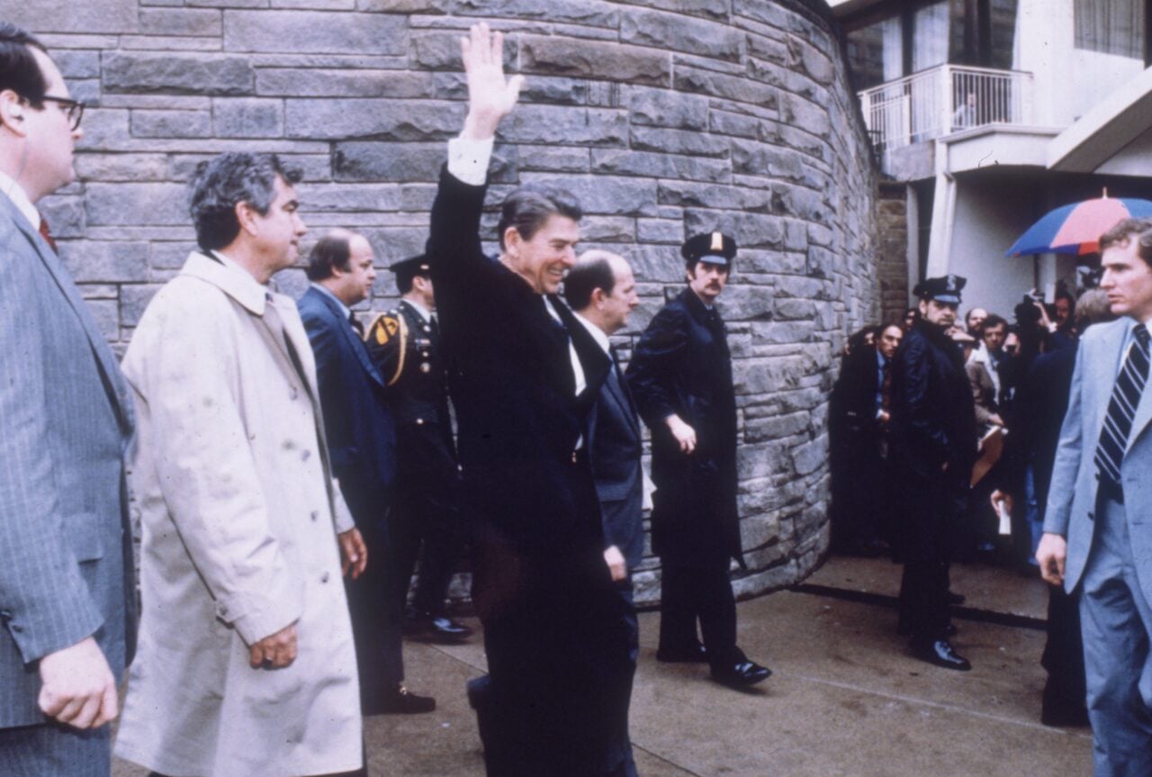 ในวันนั้น นายจอห์น ฮิงค์ลีย์ จูเนียร์ ยิงกระสุนออกไป 6 นัด นัดสุดท้ายกระดอนจากกระจกกันกระสุนของรถลิมูซีนประจำตำแหน่งผู้นำสหรัฐ แล้วเจาะเข้าที่รักแร้ซ้ายของเรแกน กระสุนแตกหักซี่โครงและทะลุเข้าปอด และหยุดอยู่ห่างจากหัวใจของเรแกนเพียง 2.5 เซนติเมตร
