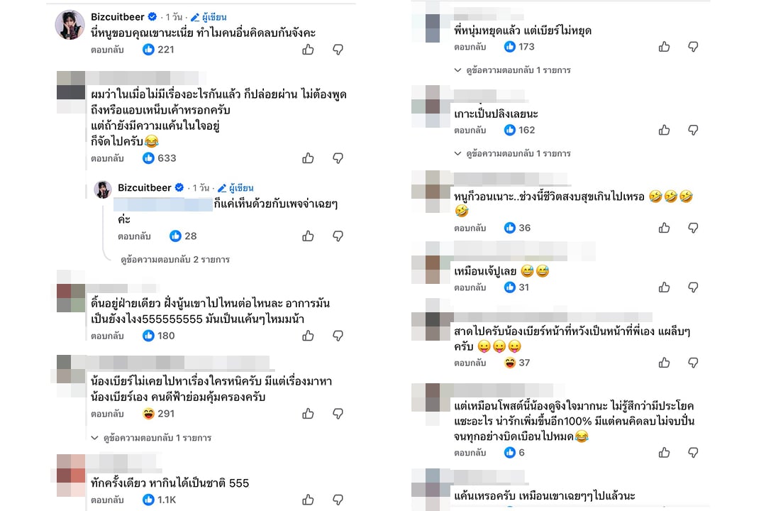งานนี้หลายคนก็มาเมนต์มากมายในหลากหลายแง่มุม อาทิ สวยอ่ะ ชอบ, นี่ไม่ได้แซะพี่หนุ่มไหม, รักเบียร์ครับ, ชอบเบียร์นะ ตรงไปตรงมา แต่เกาะไหม, เกาะพี่หนุ่มเหรอ, สงสารนะ อย่าทำแบบนี้เลยเบียร์ อย่าไปเกาะเขา, น้องสำนึกเหรอครับ, รักเบียร์นะ แต่อย่าหาเรื่องเลย เป็นต้น