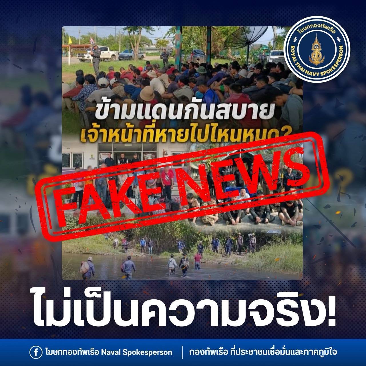 นอกจากนี้ โฆษกกองทัพเรือ ยังเปิดเผยว่า ตามที่ปรากฏคลิปวิดีโอและข้อความในสื่อสังคมออนไลน์ กล่าวว่ามีการปล่อยปละให้มีการลักลอบข้ามแดนในพื้นที่ดังกล่าวโดยไม่มีการดำเนินการจากเจ้าหน้าที่นั้น ขอยืนยันว่าเป็น “ข่าวปลอม” เนื่องจากมีการนำภาพเหตุการณ์เก่ามานำเสนอใหม่ด้วยข้อความที่คลาดเคลื่อนจากข้อเท็จจริง โดยเหตุการณ์ดังกล่าวเกิดขึ้นเมื่อวันที่ 12 พฤศจิกายน 2568 (ปีที่แล้ว) ซึ่งตามภาพ ชาวกัมพูชาที่หลบหนีเข้าเมือง จำนวน 108 คน และเหตุการณ์เมื่อวันที่ 15 มกราคม 2568 ผู้ต้องหาชาวจีน 13 คน และสุดท้ายเมื่อวันที่ 19 มีนาคม 2569 ผู้ต้องหาชาวกัมพูชาและชาวไทย (คนนำพา) 17 คน รวมผู้ต้องหา 138 คนนั้น ได้ถูกหน่วยเฉพาะกิจนาวิกโยธินจันทบุรีจับกุมได้ทั้งหมด และได้ส่งดำเนินคดีตามกฎหมายเรียบร้อยแล้ว
