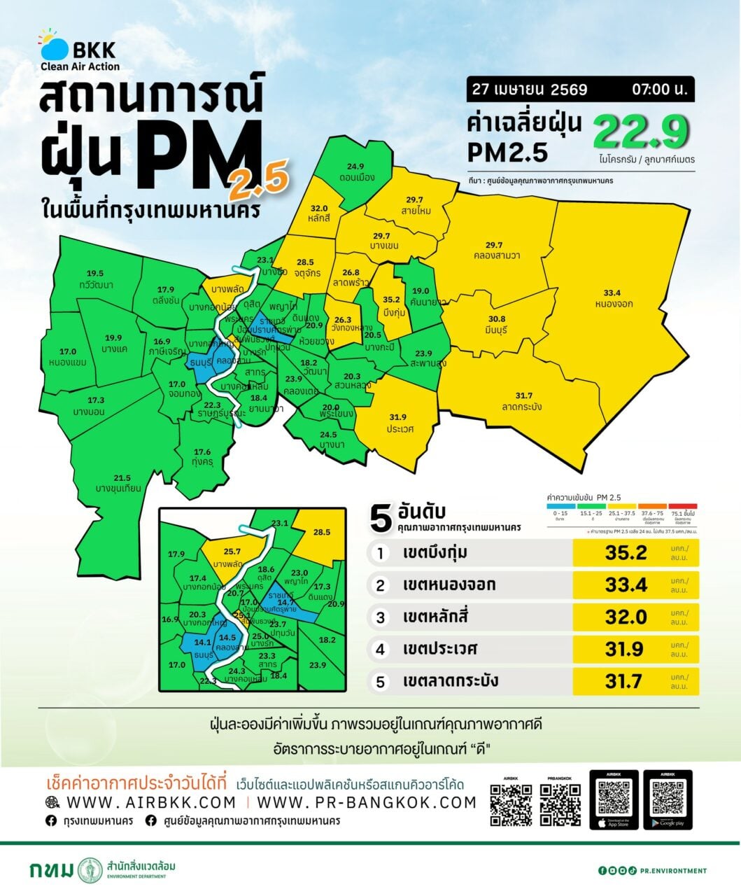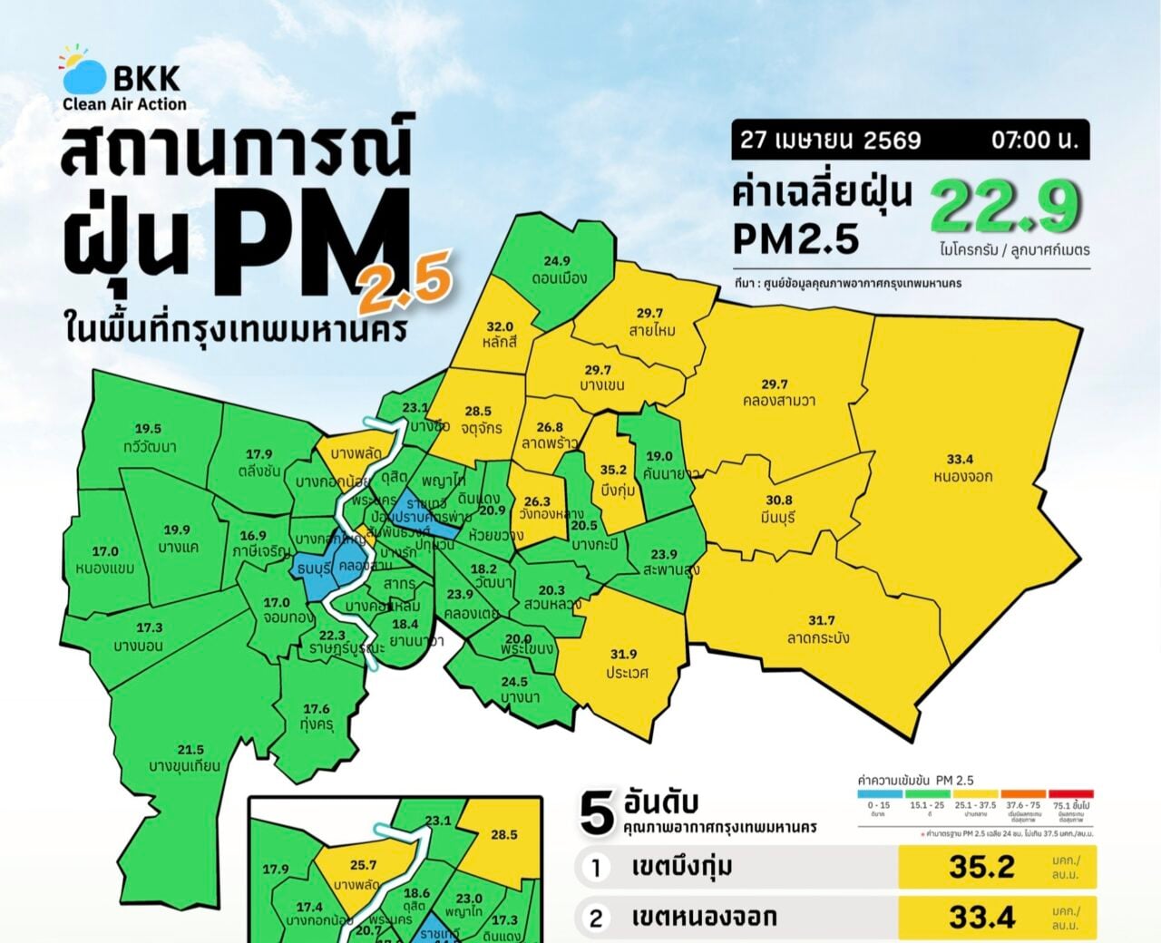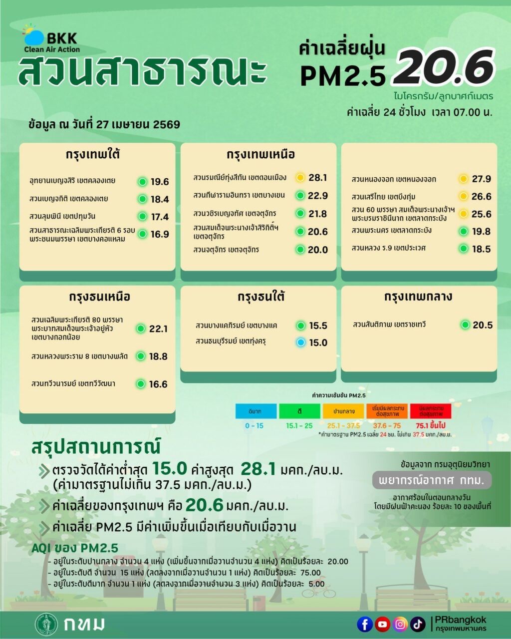เมื่อเวลา 08.50 น.วันที่ 27 เม.ย. ผู้สื่อข่าวรายงานว่า ทีมโฆษกศูนย์ข้อมูลคุณภาพอากาศกรุงเทพมหานครรายงานสถานการณ์ฝุ่นละอองขนาดไม่เกิน 2.5 ไมครอน (PM 2.5) ของสถานีตรวจวัดคุณภาพอากาศของกรุงเทพมหานคร ประจำวันที่ 27 เม.ย.69 เวลา 07.00 น. ค่าเฉลี่ย 24 ชั่วโมง ของฝุ่นPM2.5