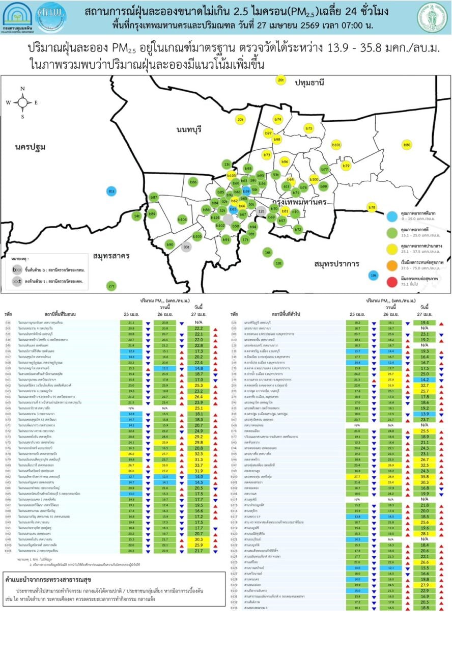 เมื่อวันที่ 27 เม.ย. ศูนย์สื่อสารการแก้ไขปัญหามลพิษทางอากาศ รายงานการติดตามตรวจสอบคุณภาพอากาศภาพรวมปริมาณ PM2.5 ในประเทศพบเกินค่ามาตรฐานใน จ.เชียงราย จ.เชียงใหม่ จ.สุโขทัย จ.พิษณุโลก จ.ตาก จ.พิจิตร จ.อุทัยธานี จ.ชัยนาท จ.สุพรรณบุรี จ.ฉะเชิงเทรา จ.อุบลราชธานี และ จ.นครราชสีมา