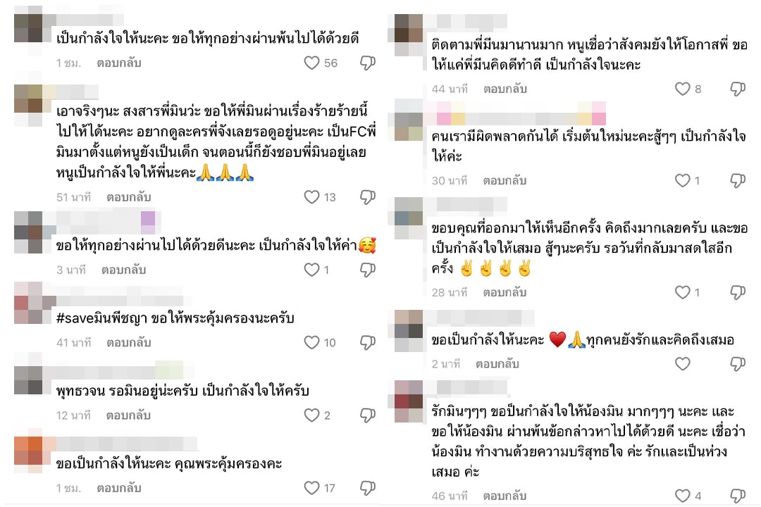 ล่าสุดหลังจากบอสมินออกมาอัปเดตปมนี้ใน TikTok หลายคนก็เข้ามาแสดงความเห็นมากมาย ทั้งในแง่ของความสงสารที่เจอชะตากรรมนี้ บ้างก็บอกว่าทำอะไรไว้ก็ต้องรับกรรม บ้างก็บอกว่า อย่าซ้ำกันเลย บ้างก็บอกว่าเหลือพื้นที่ให้มินด้วย บ้างก็บอกว่ารักมินมาก เป็นต้น