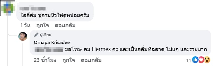 เมื่อมีชาวเน็ตรายหนึ่งเข้ามาคอมเมนต์แซะใต้โพสต์ว่า “ใส่สีส้ม ชูสามนิ้วให้ดูหน่อยครับ” งานนี้มีหรือแม่ม้าจะอยู่เฉย เจ้าตัวฟาดกลับนิ่มๆ แต่ทำเอาหน้าสั่นไปทั้งโซเชียลด้วยข้อความสุดจี๊ดว่า “ขอโทษ สม Hermes ค่ะ และเป็นสลิ่มที่ฉลาด ไม่แก่ และรวยมาก”