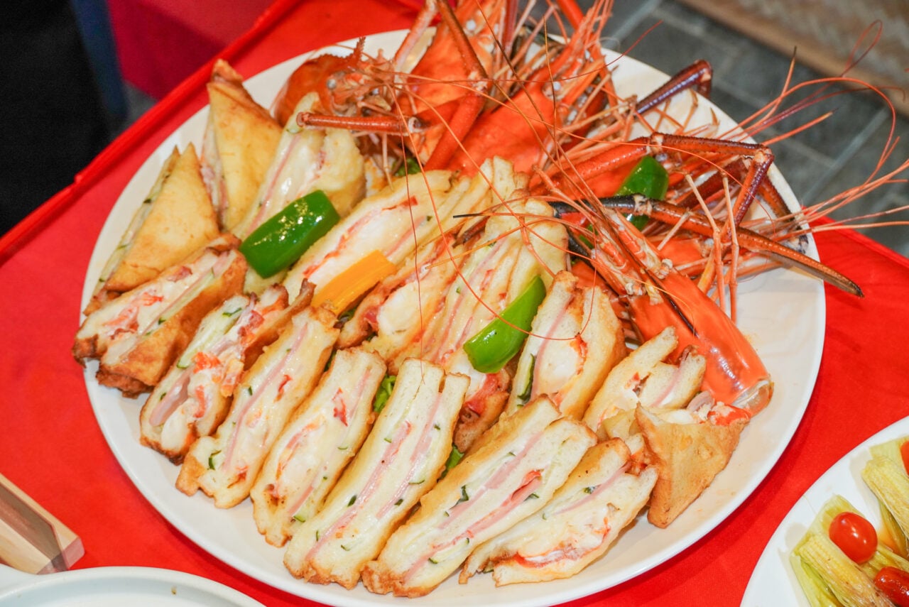 สำหรับ “สลัดไข่ปลากระบอกสไตล์เหอเฟิง” ส่วนผสมหลักคือ “ไข่ปลา” ที่ผ่านการดองเกลือและตากแห้งในไต้หวัน มีสีส้มทองและรสชาติเข้มข้น จึงได้รับฉายาว่า “ทองคำดำแห่งท้องทะเล” เป็นอาหารสร้างสรรค์ที่ผสมผสานส่วนผสมแบบดั้งเดิมของไต้หวันเข้ากับสไตล์การทำอาหารสมัยใหม่ อาหารจานนี้มักถูกมองว่าเป็นอาหารเรียกน้ำย่อยแบบ “ฟิวชั่น” ซึ่งเป็นการผสมผสานระหว่างสลัดสไตล์ตะวันตกกับส่วนผสมแบบดั้งเดิมของไต้หวัน ไม่เพียงแต่ให้ความสมดุลระหว่างสุขภาพและความอร่อยเท่านั้น แต่ยังแสดงให้เห็นถึงความหลากหลายของอาหารไต้หวันอย่างเต็มที่อีกด้วย ส่วน “ขนมปังหน้ากุ้ง” นั้น นำกุ้งมาหมักด้วยน้ำตาลและพริกไทยก่อน จากนั้นชุบด้วยไข่ขาวตีฟู แป้ง น้ำมันพืช และผงฟู แล้วนำไปทอดในกระทะจนเหลืองกรอบและราดด้วยน้ำสลัด เป็นอาหารที่ผสมผสานระหว่างกุ้งและไข่ เป็นการผสมผสานรสชาติแบบไต้หวันดั้งเดิมกับสไตล์ตะวันตก