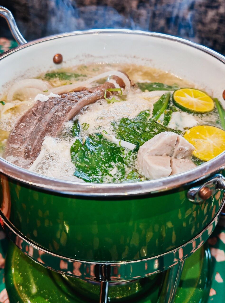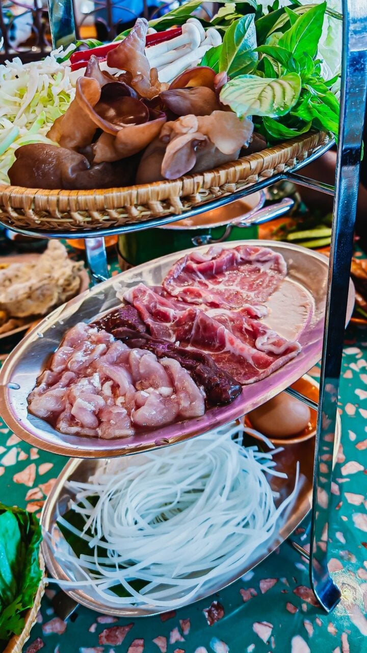 ซุปหม้อไฟแจ่วฮ้อน – ซดน้ำซุปร้อนๆ ให้คล่องคอ หม้อนี้หอมกลิ่นสมุนไพรแจ่วฮ้อนเตะจมูก รสชาติเข้มข้นเผ็ดร้อนกำลังดี ซดกินคู่กับวัตถุดิบเนื้อสัตว์และผักพรีเมียมที่ให้มาแบบจัดเต็ม
