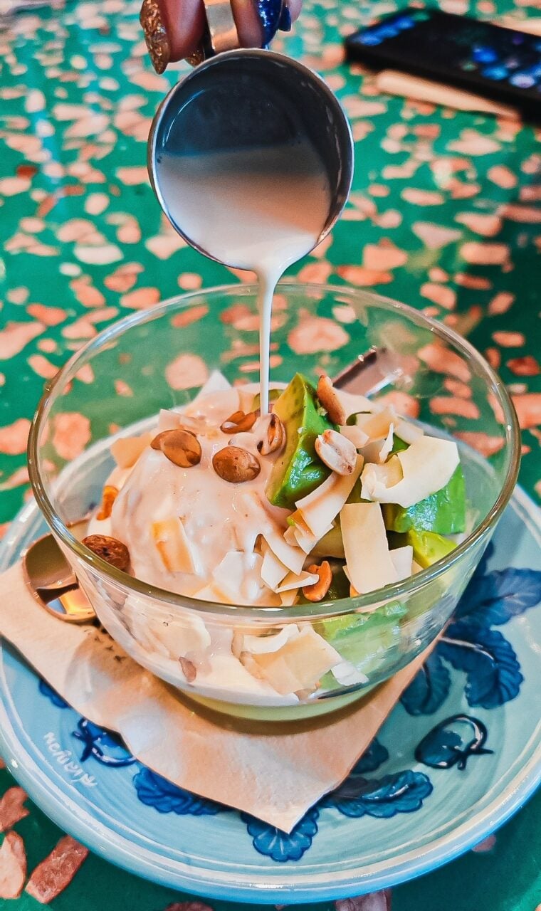 ไอศกรีมอะโวคาโดกะทิสด – ปิดท้ายมื้ออาหารแบบสวยๆ ด้วยของหวาน ความมันนวลของเนื้ออะโวคาโด ตัดกับความหอมหวานของกะทิสด เป็นการล้างปากที่ละมุน และดับความเผ็ดร้อนได้ชื่นใจที่สุด