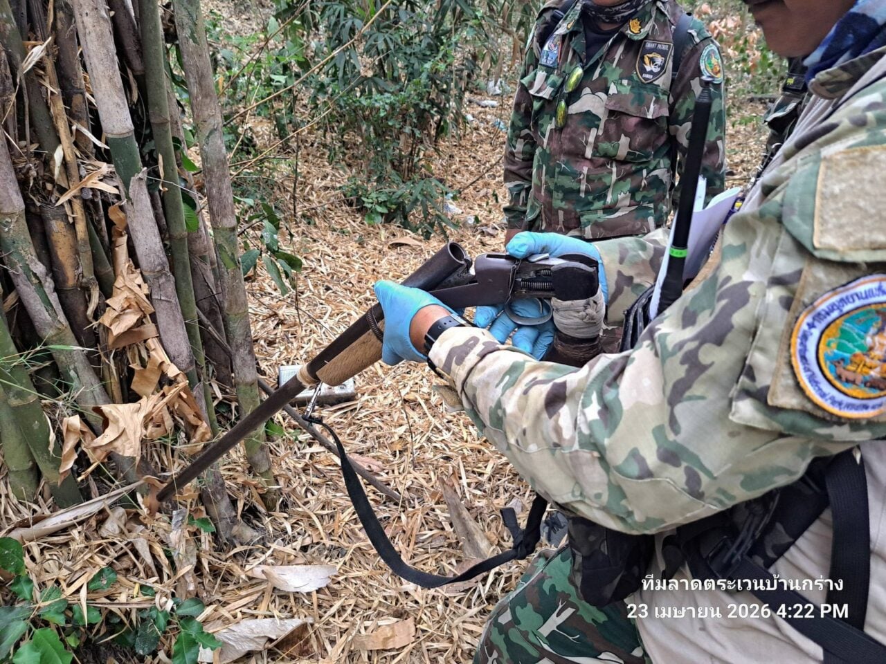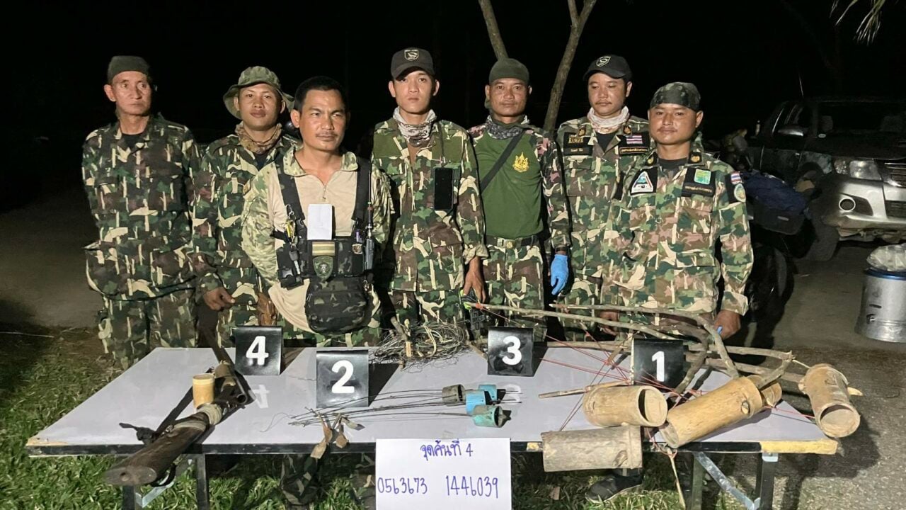 โดยเมื่อเวลา 11.00 น. วันที่ 23 เม.ย. 69 นายมงคล ไชยภักดี หัวหน้าอุทยานแห่งชาติแก่งกระจาน สั่งการเจ้าหน้าที่อุทยานแห่งชาติแก่งกระจาน ดำเนินการเข้าตรวจค้นบ้านต้องสงสัยในพื้นที่หมู่บ้านแม่คะเมยบน อ.หนองหญ้าปล้อง จ.เพชรบุรี รวมทั้งสิ้น 5 จุด พบอุปกรณ์ที่ใช้ในการกระทำความผิดและซากสัตว์ป่าจำนวนมาก ดังนี้ จุดที่ 1 ตรวจสอบพื้นที่แปลง ม.64 ของนายทวี (สงวนนามสกุล) พบของกลางสำคัญประกอบด้วย บ่วงดักสัตว์และบ่วงตวิดสลิง, ด้วงดักแย้ 12 อัน, เครื่องกระสุนปืนลูกซอง และที่น่าสลดใจคือพบซากจมูกเม่น 5 ชิ้น และหางเม่น อีก 3 ชิ้น จุดที่ 2 และจุดที่ 3 เจ้าหน้าที่ขยายผลตรวจค้นบริเวณพื้นที่ใกล้เคียง พบกระสุนปืนลูกซอง แร้วดักสัตว์ และซากปีกนกเหยี่ยว นอกจากนี้ ยังสามารถตรวจยึดอาวุธปืนลูกซองเดี่ยว จำนวน 1 กระบอก และสลิงดักสัตว์บริเวณขอบแปลง จุดที่ 4 และจุดที่ 5 ตรวจยึดอาวุธปืนลูกซองเดี่ยวอีก 1 กระบอก พร้อมอุปกรณ์บำรุงรักษา และปืนอัดแก๊สไทยประดิษฐ์ (ท่อพีวีซีลำกล้องเหล็ก) อีก 1 กระบอก รวมถึงแร้วดักตุ่นและแร้วดักอ้นอีกหลายรายการ