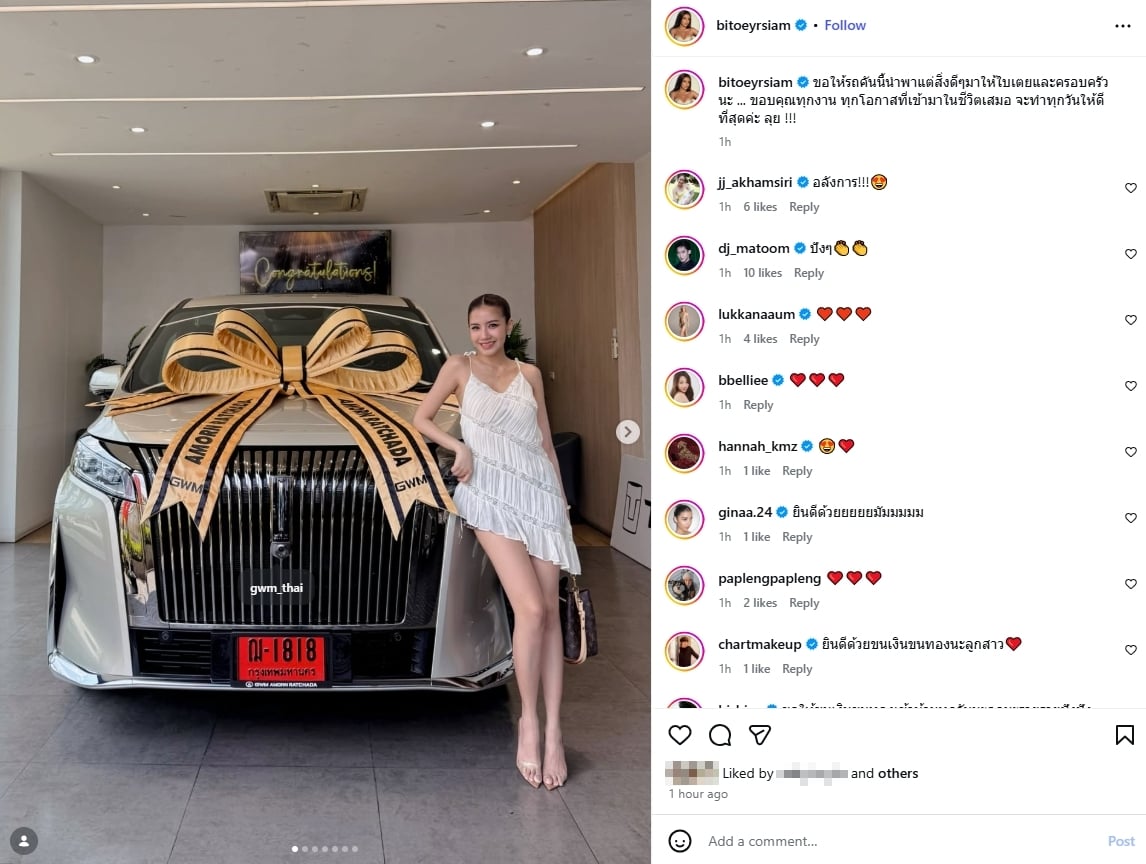 ทางด้านสาวใบเตยก็ได้ระบุแคปชั่นผ่านโซเชียลมีเดียถึงรถคันใหม่นี้ว่า “ขอให้รถคันนี้นำพาแต่สิ่งดีๆ มาให้ใบเตยและครอบครัวนะ ขอบคุณทุกงาน ทุกโอกาสที่เข้ามาในชีวิตเสมอ จะทำทุกวันให้ดีที่สุดค่ะ ลุย!!!”