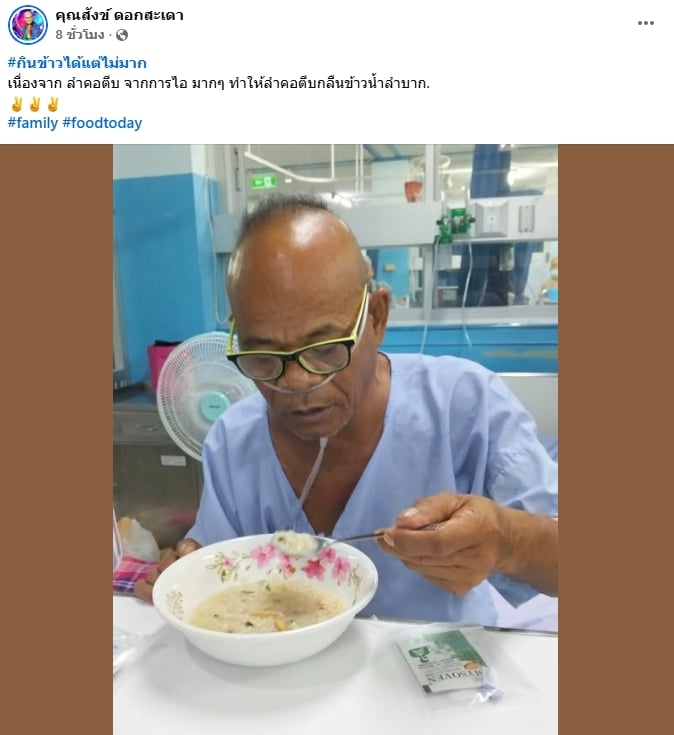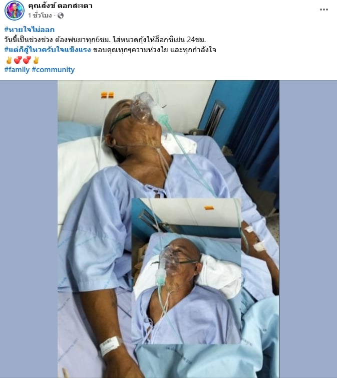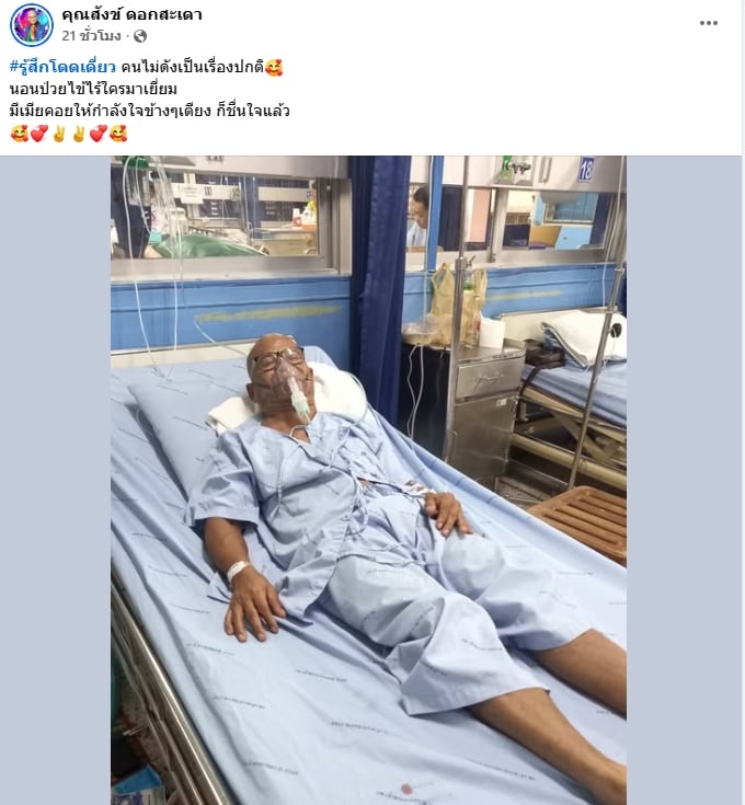 โดยเมื่อวันที่ 26 เมษายนที่ผ่านมา ตลกชื่อดังได้เปิดใจผ่านเฟซบุ๊กส่วนตัว โดยระบุข้อความว่า “ยังสู้ได้อีกหลายยกนะ ใจสู้ซะอย่าง อะไรจะเกิดก็ให้มันเกิด” พร้อมกันนี้ยังได้โพสต์ตัดพ้อว่า “รู้สึกโดดเดี่ยว คนไม่ดังเป็นเรื่องปกติ นอนป่วยไข้ไร้ใครมาเยี่ยม มีเมียคอยให้กำลังใจข้างๆ เตียง ก็ชื่นใจแล้ว”