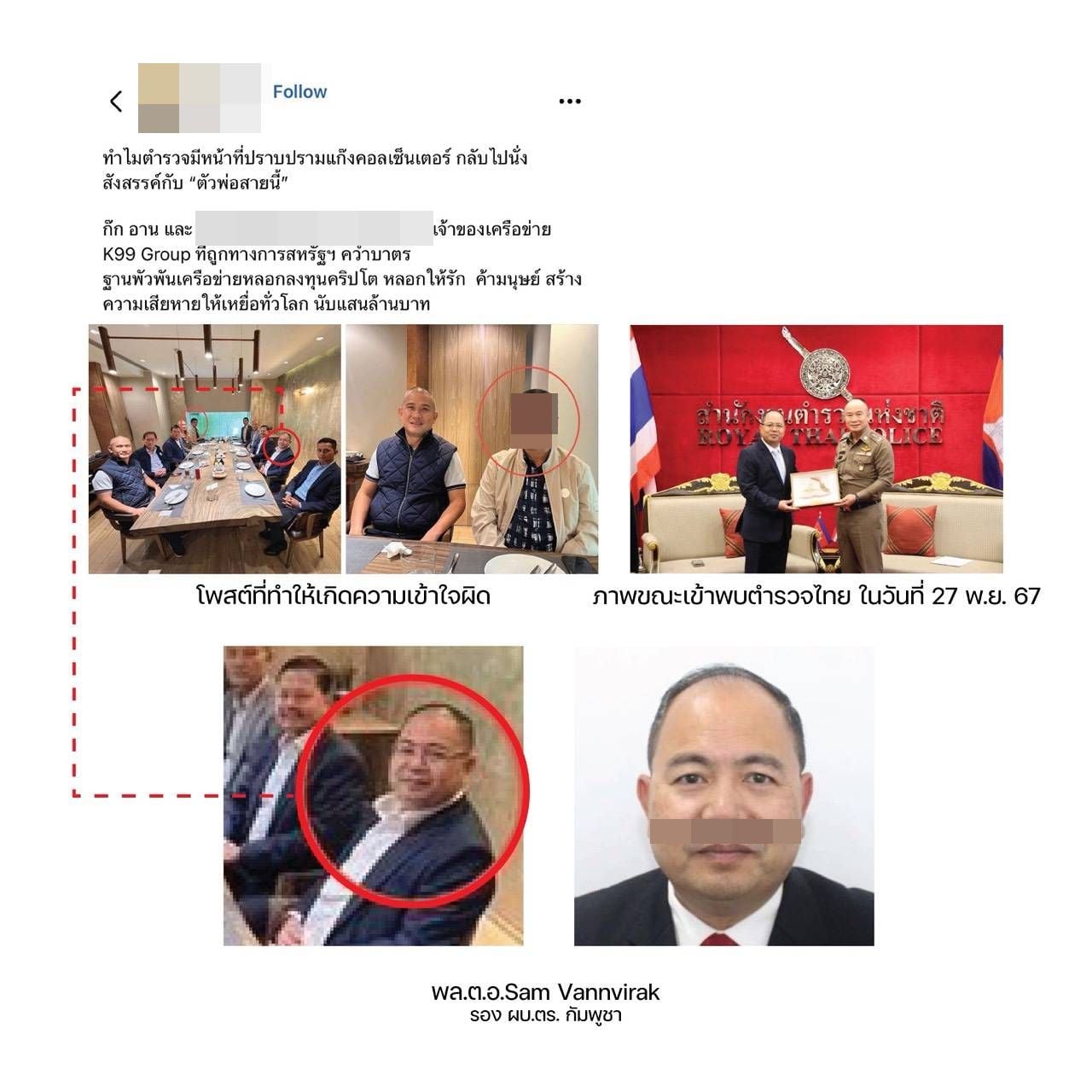 เกี่ยวกับเรื่องนี้ ทางศูนย์ต่อต้านการฉ้อโกงออนไลน์ (ACSC) ภายใต้การอำนวยการ พล.ต.อ.ธนา ชูวงศ์ รอง ผบ.ตร./ผอ.ศปอส.ตร. และ พล.ต.ท.จิรภพ ภูริเดช ผู้ช่วย ผบ.ตร./รอง ผอ.ศปอส.ตร. โพสต์ข้อความชี้แจงข้อเท็จจริงในกรณีดังกล่าว ว่า ภาพข้างต้นเป็นภาพที่เกิดขึ้นจริงโดยบุคคลในภาพเป็นคณะของ พล.ต.อ.Sam Vannvirak รอง ผบ.ตร. ของกัมพูชา มาพบกับคณะตำรวจไทย ที่ร้านอาหารแห่งหนึ่งในห้างสรรพสินค้าพารากอน กทม.เพื่อหารือขอความร่วมมือในการปราบปรามสแกมเมอร์ เมื่อวันที่ 27 พ.ย.67
