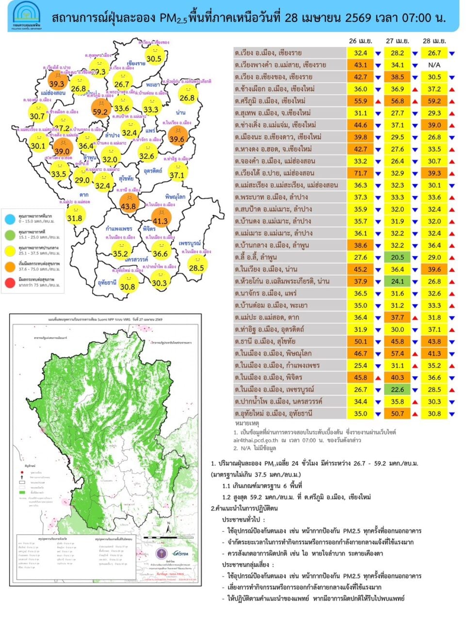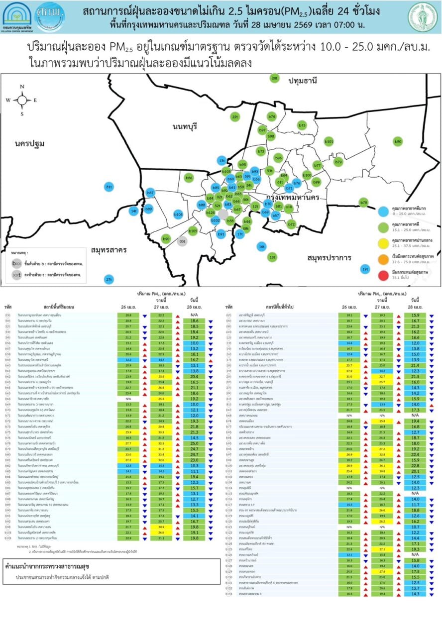 เมื่อวันที่ 28 เม.ย. ศูนย์สื่อสารการแก้ไขปัญหามลพิษทางอากาศ รายงานการติดตามตรวจสอบคุณภาพอากาศสรุปภาพรวมปริมาณ PM2.5 ในประเทศพบเกินค่ามาตรฐานใน จ.แม่ฮ่องสอน จ.เชียงใหม่ จ.น่าน จ.สุโขทัย จ.พิษณุโลก จ.ขอนแก่น จ.มหาสารคาม จ.อุบลราชธานี และ จ.ศรีสะเกษ