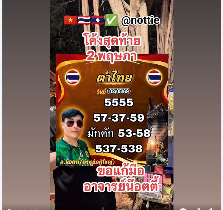สำหรับเลขชุด 2 ตัว อ.น๊อตตี้ให้แนวทางไว้คือ 57 – 37 – 59 ส่วนเลขชุด 3 ตัว ได้แก่ 537 – 538 ขณะที่เลขชุด 4 ตัวที่สร้างความฮือฮา คือ 5555 ซึ่งเป็นเลขเบิ้ลล้วน