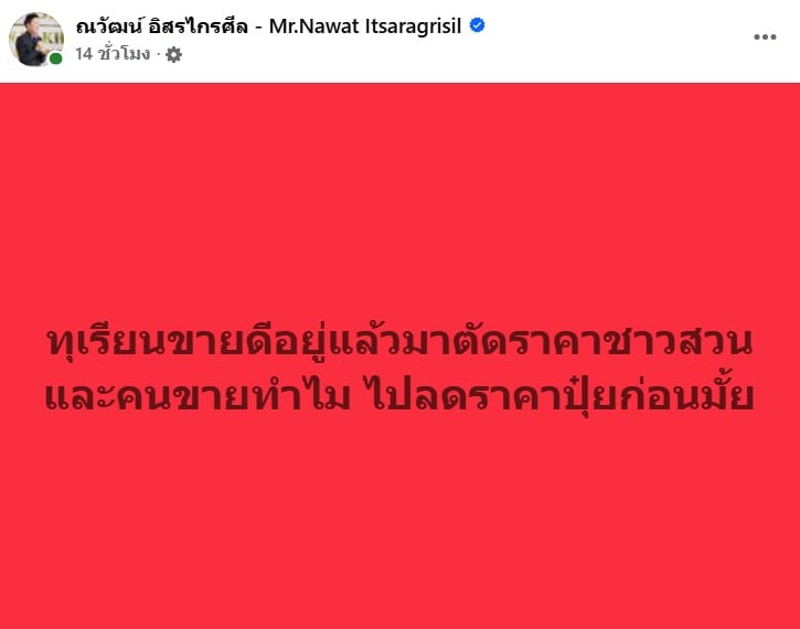 งานนี้ตัวพ่อแห่งการ Call Out อย่าง “ณวัฒน์ อิสรไกรศีล” ไม่อยู่เฉย ออกมาโพสต์ฟาดเดือดผ่านเฟซบุ๊กส่วนตัว ตอกหน้าคนต้นคิดแบบไม่ไว้หน้า โดยบอสณวัฒน์ได้ตั้งคำถามสำคัญว่า ทุเรียนเป็นสินค้าที่ขายดีอยู่แล้ว จะมาตัดราคาทำร้ายคนหาเช้ากินค่ำทำไม พร้อมเสนอแนะว่าถ้าอยากช่วยจริง “ไปลดราคาปุ๋ยก่อนมั้ย” ซึ่งเป็นต้นทุนที่แท้จริงของเกษตรกร