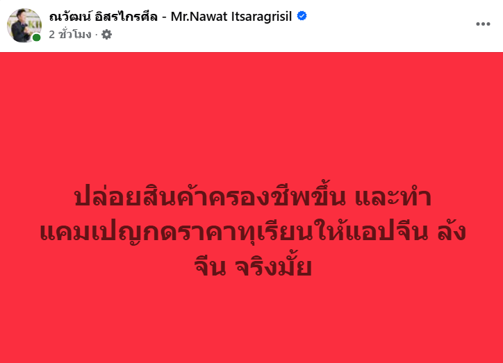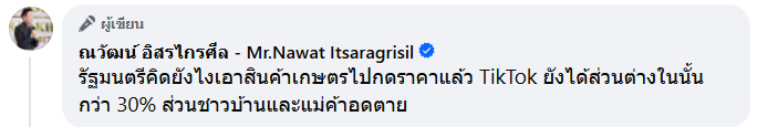 บอสณวัฒน์ยังโพสต์คอมเมนต์ความล้มเหลวในการบริหารจัดการว่า ในขณะที่รัฐบาลปล่อยให้ค่าครองชีพทุกอย่างพุ่งสูงขึ้น แต่กลับมีนโยบายเอาสินค้าเกษตรที่เป็นรายได้หลักของชาวบ้านไปกดราคาเพื่อทำแคมเปญ แถมยังแฉเบื้องหลังการขายผ่านแพลตฟอร์มอย่าง TikTok ว่ามีการหักส่วนต่างและค่าธรรมเนียมสูงกว่า 30% “รัฐมนตรีคิดยังไงเอาสินค้าเกษตรไปกดราคา แล้ว TikTok ยังได้ส่วนต่างในนั้นกว่า 30% ส่วนชาวบ้านและแม่ค้าอดตาย!”