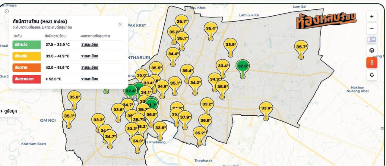 ‘แผนบริหารจัดการความร้อนในพื้นที่กรุงเทพมหานคร พ.ศ. 2569’ ของ กทม. มุ่งทำงานเพื่อดูแลสุขภาพประชาชน ลดความเสี่ยงจากภาวะเจ็บป่วยที่เกี่ยวข้องกับความร้อน และเสริมสร้างความพร้อมของเมืองในระยะยาว หนึ่งในมาตรการสำคัญที่ดำเนินการ คือ ระบบเฝ้าระวัง และเตือนภัยล่วงหน้า โดยศูนย์ข้อมูลคุณภาพอากาศกรุงเทพมหานคร ได้ติดตามค่าดัชนีความร้อนรายวัน พร้อมทั้งประสานกรมอุตุนิยมวิทยาเพื่อรับข้อมูลพยากรณ์อากาศและแนวโน้มคลื่นความร้อน แจ้งเตือนประชาชน พร้อมคำแนะนำการดูแลสุขภาพตนเองและบุคคลในครอบครัวอย่างเหมาะสม ผ่านทุกช่องทางสื่อสารของ กทม. โดยประชาชนสามารถติดตามได้แบบเรียลไทม์อย่างต่อเนื่อง ทางเว็บไซต์และแอปพลิเคชัน AirBKK รวมถึงเพจเฟซบุ๊ก ‘สำนักสิ่งแวดล้อม กรุงเทพมหานคร’ ศูนย์ข้อมูลคุณภาพอากาศกรุงเทพมหานคร ป้ายประชาสัมพันธ์ และเครือข่ายชุมชนด้วยเช่นกัน