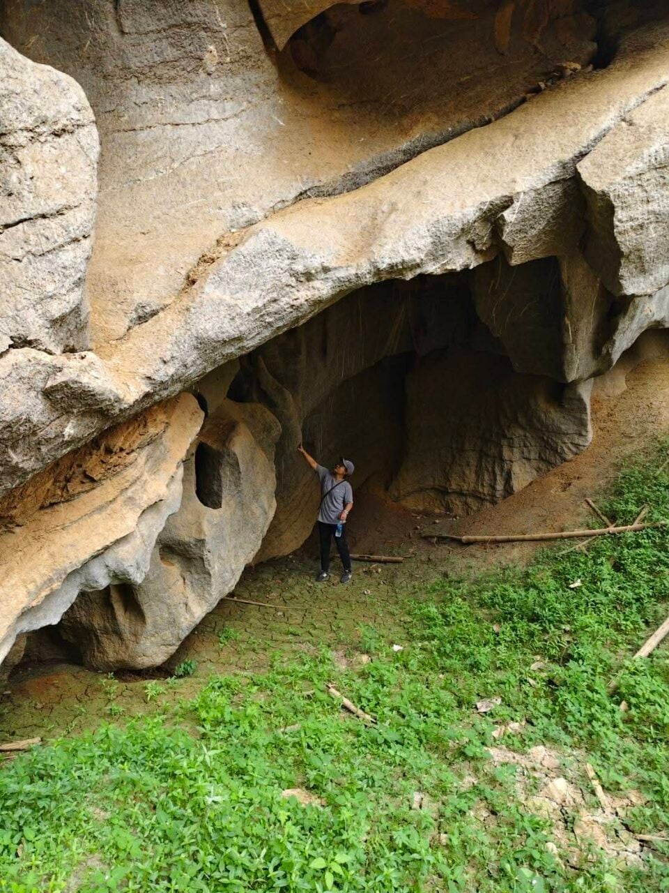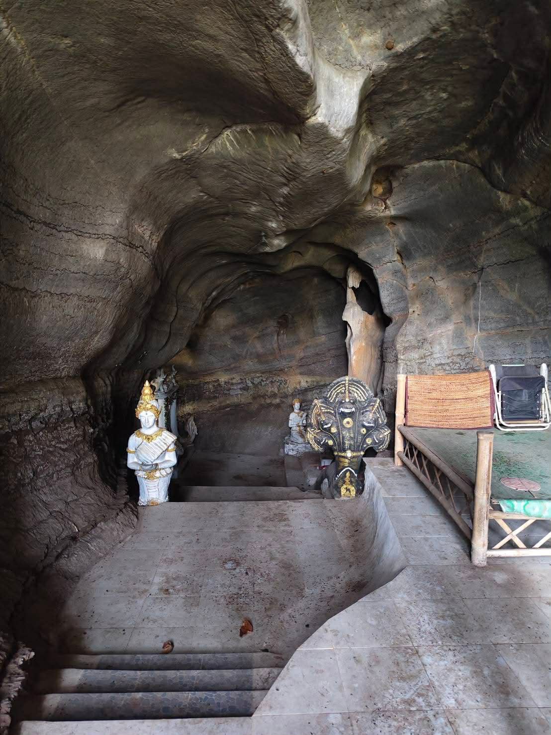 บริเวณดังกล่าวพบปากถ้ำขนาดใหญ่ กว้างประมาณ 4×5 เมตร ปกคลุมด้วยพืชพรรณหนาแน่น ภายในถ้ำมีความยาวราว 300 เมตร ลักษณะคล้ายสำนักสงฆ์ร้าง พื้นบางส่วนถูกเทคอนกรีตและปูกระเบื้อง พบรูปปั้นพญานาค องค์เทพ และเตียงไม้ไผ่ ซึ่งคาดว่าไม่ใช่สิ่งก่อสร้างจากยุคสงคราม