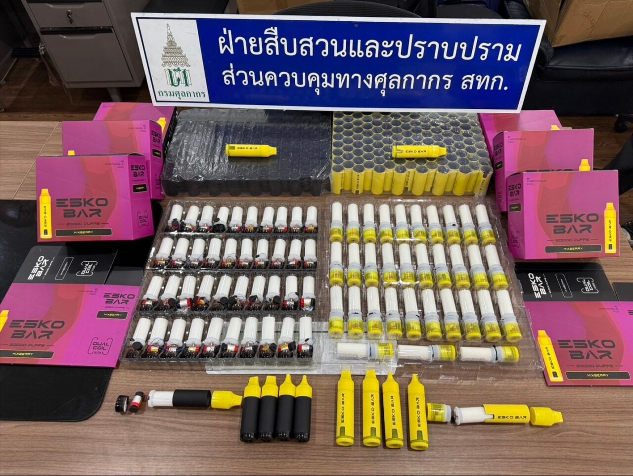 1.บุหรี่ไฟฟ้าครบชุดสมบูรณ์จำนวน 52,000 ชิ้น และน้ำยาบุหรี่ไฟฟ้าจำนวน 100 แกลลอน น้ำหนักรวมทั้งสิ้น 2,000 กิโลกรัม มูลค่า 5.56 ล้านบาท ซึ่งถือเป็นการนำสินค้าต้องห้ามเข้ามาในราชอาณาจักร อันเป็นความผิดตาม พ.ร.บ.ศุลกากร พ.ศ. 2560 ประกอบประกาศกระทรวงพาณิชย์ เรื่อง กำหนดให้บารากู่ และบารากู่ไฟฟ้าหรือบุหรี่ไฟฟ้า เป็นสินค้าที่ต้องห้ามในการนำเข้ามาในราชอาณาจักร พ.ศ. 2557