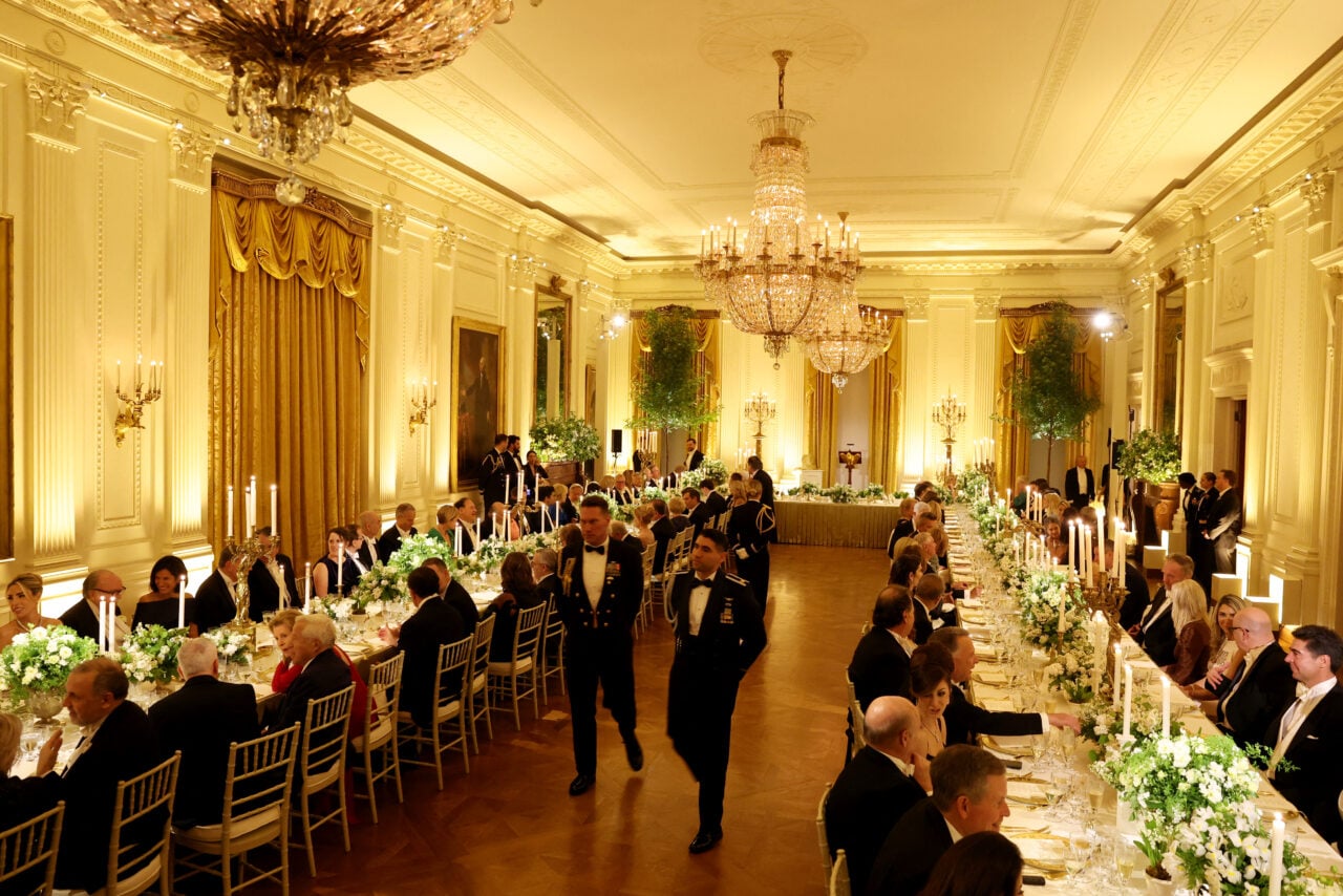 งานเลี้ยงเฉลิมฉลองในค่ำคืนนี้จัดขึ้นที่ห้องอีสต์รูมของทำเนียบขาว กำหนดการแต่งกายแบบชุดราตรีสโมสร คือผู้เข้าร่วมงานที่เป็นชายต้องสวมสูทหางยาวและผูกหูกระต่าย ซึ่งถือเป็นเรื่องที่พบได้ยากมากสำหรับทำเนียบขาว ซึ่งไม่ได้จัดงานลักษณะนี้มา 19 ปีแล้ว หรือนับตั้งแต่ครั้งที่สมเด็จพระราชินีนาถเอลิซาเบธที่ 2 พระราชมารดาสมเด็จพระเจ้าชาลส์ที่ 3 เสด็จฯเยือนสหรัฐเมื่อปี 2550 ในสมัยประธานาธิบดีจอร์จ ดับเบิลยู. บุช.