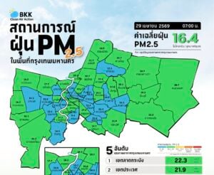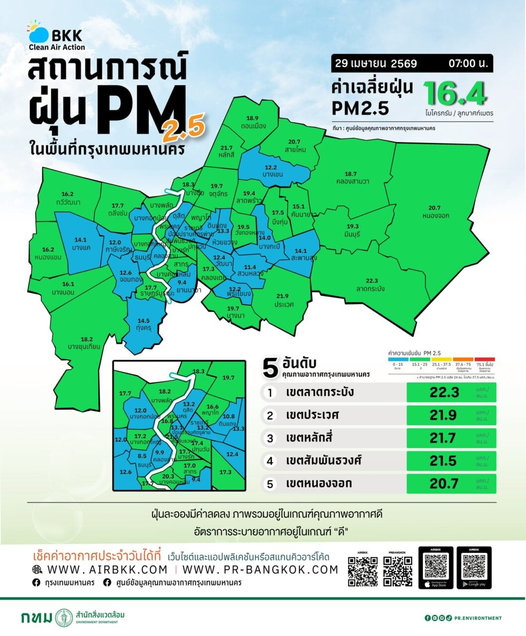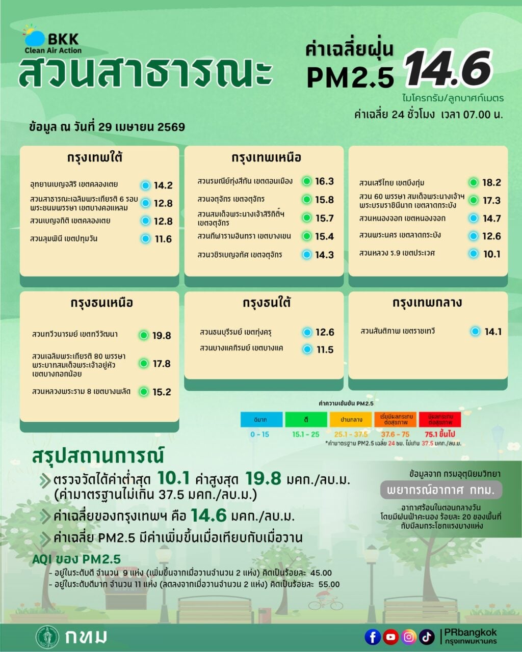 รายงานสถานการณ์ฝุ่นละอองขนาดไม่เกิน 2.5 ไมครอน (PM 2.5) ของสถานีตรวจวัดคุณภาพอากาศของกรุงเทพมหานคร ประจำวันที่ 29 เม.ย.69 เวลา 07.00 น. ค่าเฉลี่ย 24 ชั่วโมง ของฝุ่นละอองขนาดไม่เกิน 2.5 ไมครอน (PM2.5)