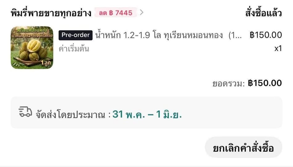 เมื่อวันที่ 29 เม.ย. น.ส.วริสา มีเจริญ ผู้สมัคร สส.บัญชีรายชื่อ พรรคประชาชน โพสต์ภาพคำสั่งซื้อทุเรียนในช่องทางขายออนไลน์ของ “พิมรี่พายขายทุกอย่าง” พร้อมข้อความระบุว่า นี่เป็นคำสั่งซื้อทุเรียนคุณพิมรี่พาย 28 เม.ย. (ออร์เดอร์นี้ไม่ใช่ลูกละ 100) จะเห็นได้ว่าจัดส่งได้ 31 พ.ค. ก็ค่อนข้างตกใจว่านานไปหรือไม่ หรืออาจเป็นการตั้งเวลา preorder เผื่อไว้เฉยๆ อาจจะได้รับเร็ว ในช่วง 2 วันที่ผ่านมา ดิฉันได้ให้สัมภาษณ์ไปหลายรายการ ได้แจ้งถึงข้อมูลการผลิตทุเรียนภาคตะวันออกและความเข้าใจต่างๆ ไว้ตรงกับสิ่งที่เกิดขึ้นพอสมควร (เดี๋ยวค่อยมาขยายกันค่ะ)