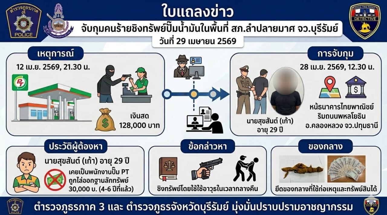 จากกรณี คนร้ายบุกเดี่ยวเข้าไปชิงเงินสดภายในปั๊มน้ำมัน PT บ้านโนนสมบูรณ์ หมูที่ 5 ต.ลำปลายมาศ อ.ลำปลายมาศ จ.บุรีรัมย์ ริมถนนสาย 226 สายลำปลายมาศ-บุรีรัมย์ ได้เงินสดไป 128,400 บาท เหตุเกิดเมื่อเวลาประมาณ 21.30 น. คืนวันที่ 12 เม.ย.ที่ผ่านมา เบื้องต้นพบว่าคนร้ายเป็นชายสูง 170 ซม. ปิดบังใบหน้ามิดชิดเดินเข้าไปชิงเงินสดภายในสำนักงาน ก่อนกระโดดข้ามกำแพงด้านหลังหลบหนีไปอย่างรวดเร็ว ภายหลัง พล.ต.ท.พฤทธิพงษ์ ประยูรศิริ ผบช.ภ.3 ได้ให้ความสนใจเป็นพิเศษ เพราะเป็นเหตุอุกฉกรรจ์คนร้ายก่อเหตุโดยไม่เกรงกลัวกฎหมาย จึงกำชับให้ พล.ต.ต.วรายุส์ จันทร์เยี่ยม ผบก.ภ.จว.บุรีรัมย์ ทำการสืบสวนและเร่งติดตามคนร้ายมาดำเนินคดีให้ได้