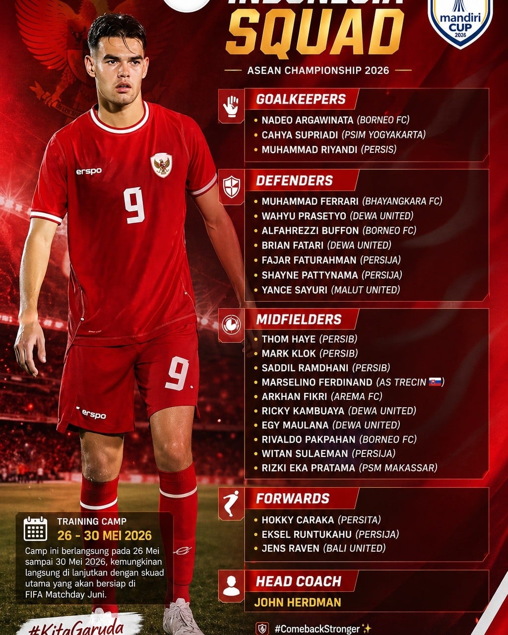 ทีมฟุตบอลทีมชาติอินโดนีเซีย ประกาศรายชื่อ 23 นักเตะ ที่จะเตรียมทำศึกฟุตบอลอาเซียนคัพ 2026 ที่จะเริ่มในช่วงปลายเดือน ก.ค. นี้แล้ว