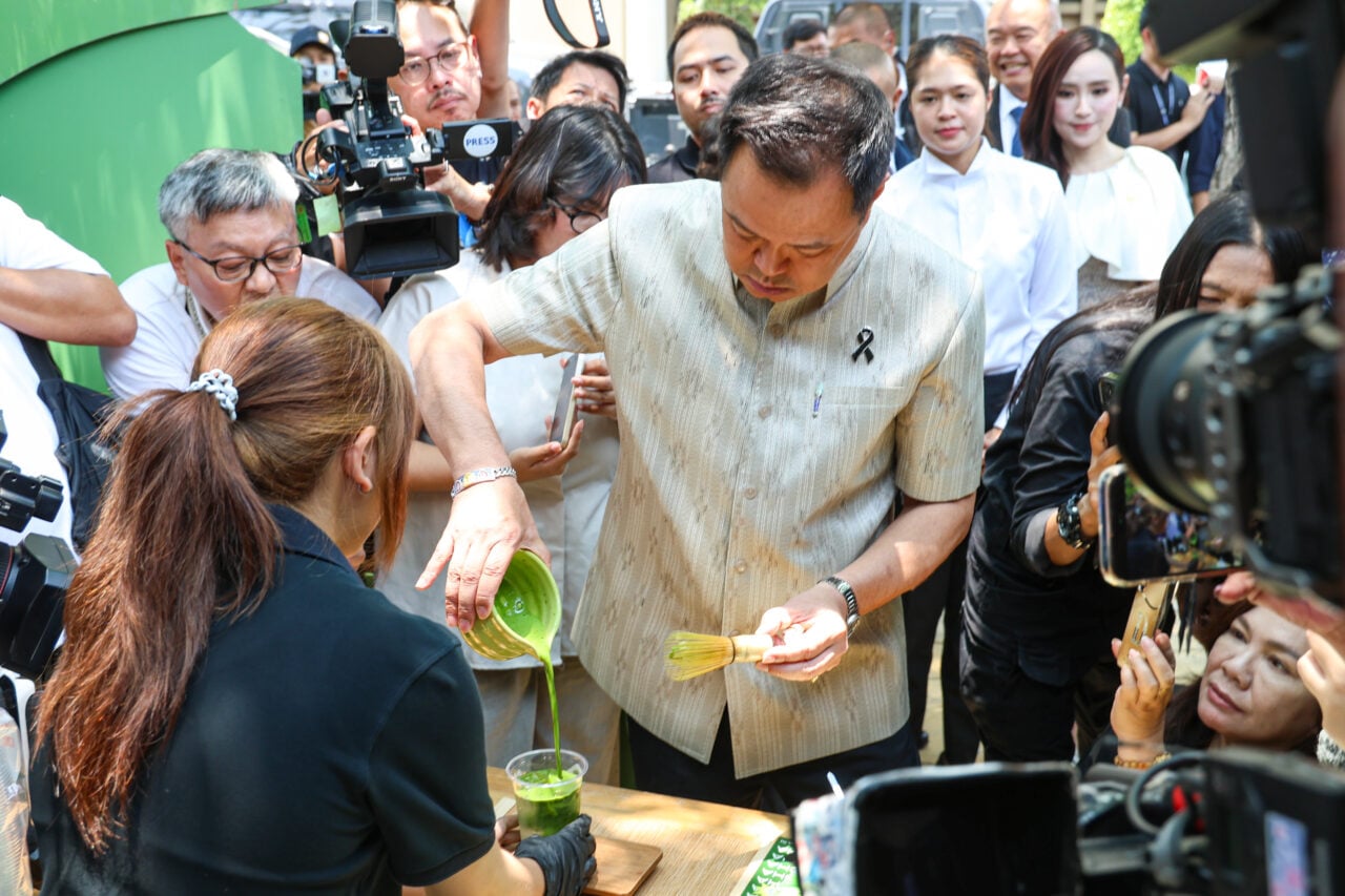 นายกฯ กล่าวว่า วันนี้ไม่ได้มาร่วมนั่งกินด้วย เพราะต้องขึ้นไปเคลียร์งานที่ค้างอยู่บนตึกไทยคู่ฟ้า แค่แวะมาทักทายและกินไอศกรีมด้วย นายกฯ ยังเดินไปสาธิตการชงชาเขียวมัทฉะ และชิมด้วยตัวเอง พร้อมระบุว่า “ขมดี”