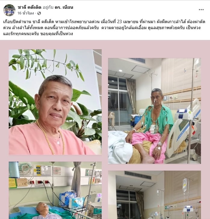 โดยเจ้าตัวได้บรรยายถึงความรู้สึกในช่วงเวลาดังกล่าวว่า ครั้งนี้ถือเป็นเหตุการณ์ที่เกือบจะกลายเป็นการ “ปิดตำนาน” ของตนเองไว้ว่า “เกือบปิดตำนาน ชาลี คดีเด็ด หามเข้าโรงพยาบาลด่วน เมื่อวันที่ 23 เมษายน ที่ผ่านมา พังผืดเกาะลำไส้ ต้องผ่าตัดด่วน ล้างลำไส้ทั้งหมด ตอนนี้อาการปลอดภัยแล้วครับ ความตายอยู่ใกล้แค่เอื้อม ดูแลสุขภาพด้วยครับ เป็นห่วงและรักทุกคนนะครับ ขอบคุณที่เป็นห่วง”