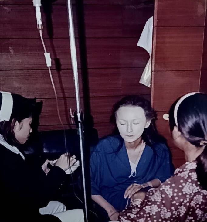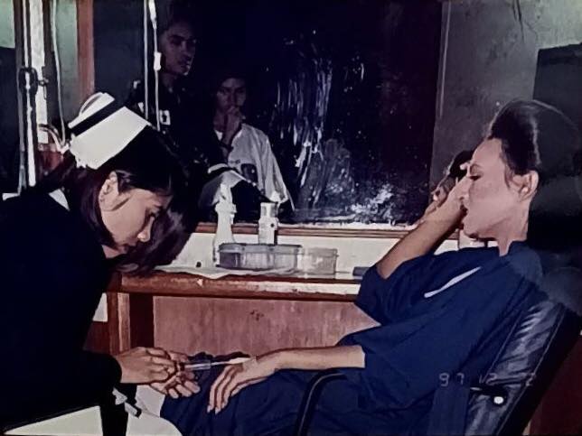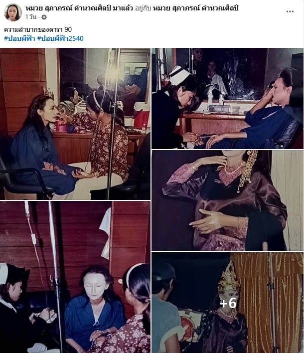 โดยภาพดังกล่าวเผยให้เห็นเหตุการณ์ขณะที่เธอกำลังนั่งทำผม เตรียมตัวเข้าฉากในบทบาท “เจ้านางละอองทอง” แต่ที่ทำเอาแฟนๆ อึ้งไปตามๆ กัน คือภาพที่เธอกำลังนั่งให้น้ำเกลือและฉีดยาโดยมีพยาบาลดูแลอย่างใกล้ชิด ทั้งที่ใบหน้ายังคงแต่งเอฟเฟกต์สีซีดขาวและสวมชุดนักแสดงแบบเต็มยศ พร้อมระบุข้อความสั้นๆว่า “ความลำบากของดารา 90 #ปอบผีฟ้า #ปอบผีฟ้า2540”