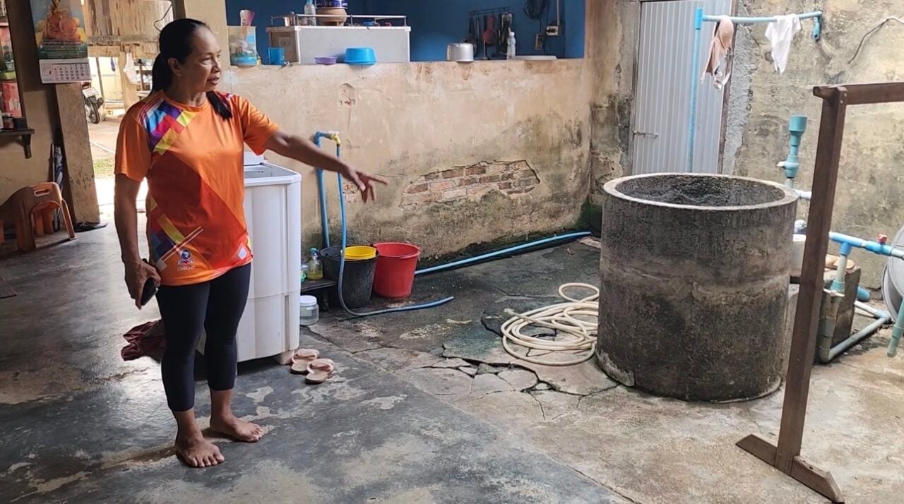 โดยพบ นางออยใจ แก้วจินดา อายุ 44 ปี เจ้าของบ้านยกพื้นใต้ถุนสูงหลังหนึ่ง ที่ได้รับเงินเยียวยาเพียง 350 บาท ได้นำผู้สื่อข่าวเข้าไปตรวจสอบความเสียหายของโครงสร้างภายในห้องเก็บของใต้ถุนบ้าน พร้อมบอกว่า น้ำท่วมบ้านตนสูงประมาณหัวเข่า แต่น้ำก็เข้าท่วมภายในห้องเก็บของที่มีอุปกรณ์เครื่องใช้ไฟฟ้า ทั้งทีวี เครื่องซักกผ้า หม้อหุงข้าว และเสื้อผ้า ได้รับความเสียหายทั้งหมด ขณะเดียวกัน ฝาผนังก็ร้าว เนื่องจากโครงสร้างทรุดตัว